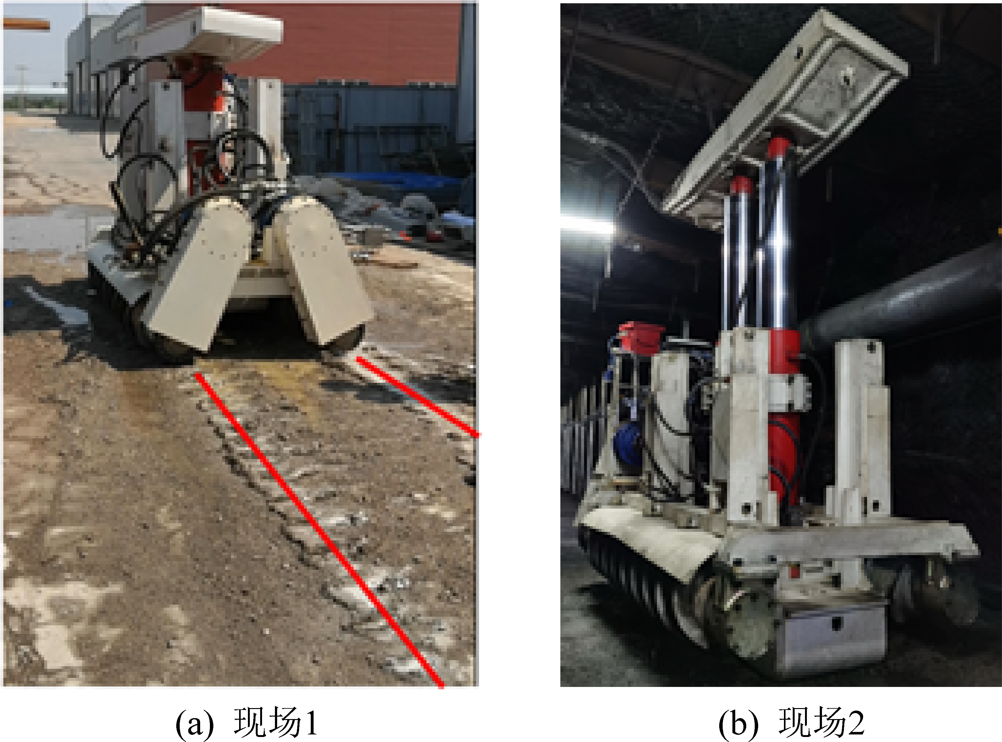 为了解决目前超前支架反复支撑破坏巷道顶板难题,研发了基于螺旋推进器的全向移动式超前支架(图8a)。该型支架结构简单、操作方便,只需改变左右螺旋推进器的旋向和转速即可实现超前支架的前进、后退、侧向平移和旋转的全方位行走[11]。该支架在阳煤集团新元矿31004工作面回风巷进行井下工业性试验(图8b),效果良好。
