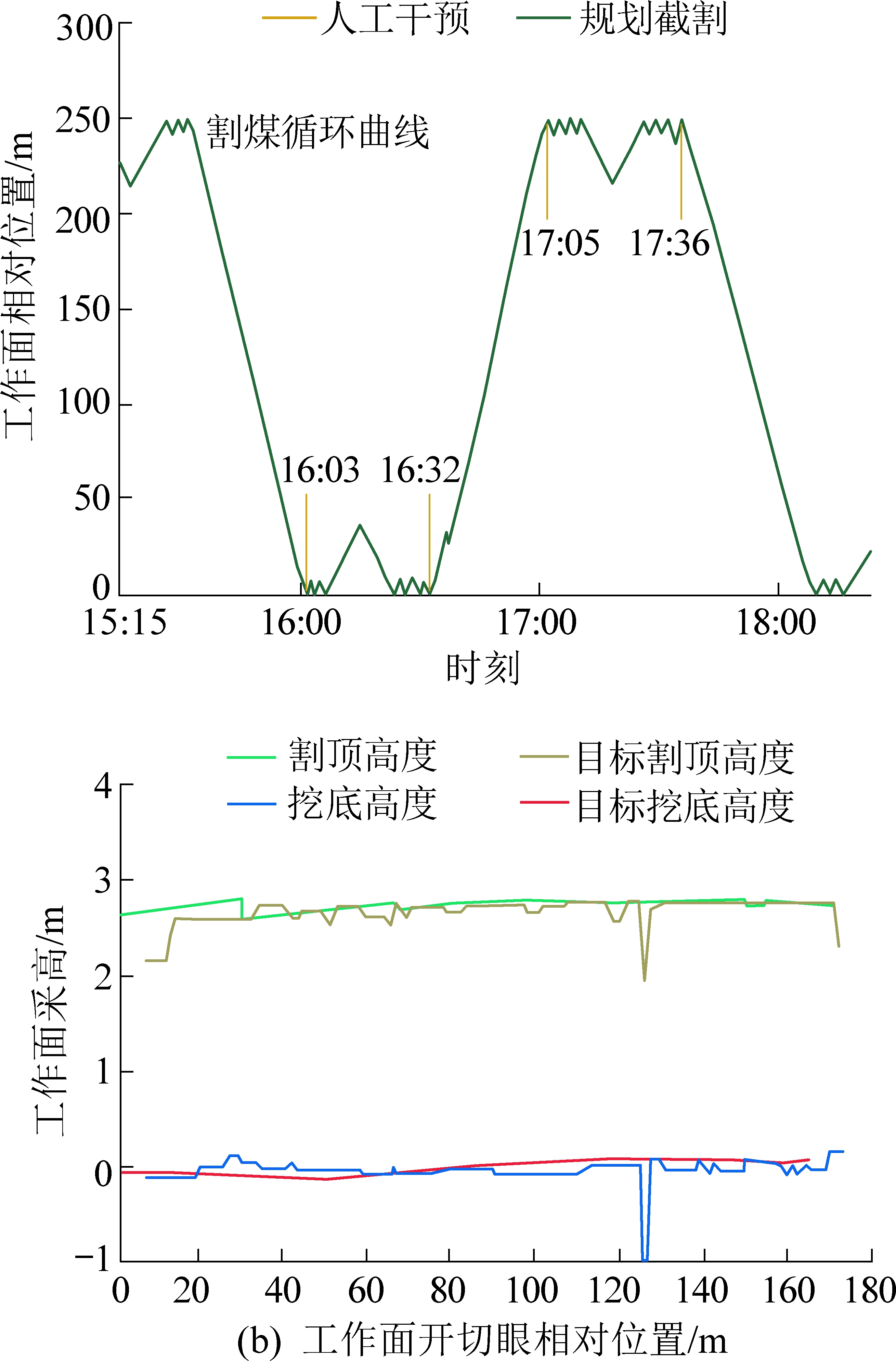 以黄陵矿业公司一号煤矿810综采工作面为研究对象,开展了基于透明地质的大数据精准开采研究。810智能化综采工作面位于井田八盘区西翼,工作面可采长度950 m,宽度261 m,煤层厚度1.3~3.0 m,平均厚度2.72 m。通过3个阶段的现场试验,绘制了试验过程中实际截割曲线、地质曲线和人工干预数据,结果如图11所示。由图11可知,通过基于地质大数据的精准智能开采能够实现全工作面高效自主规划截割,实际截割曲线和规划曲线已基本一致。工作面实现无人开采,全工作面规划截割采煤工艺的高效自主执行,全程无人工干预。