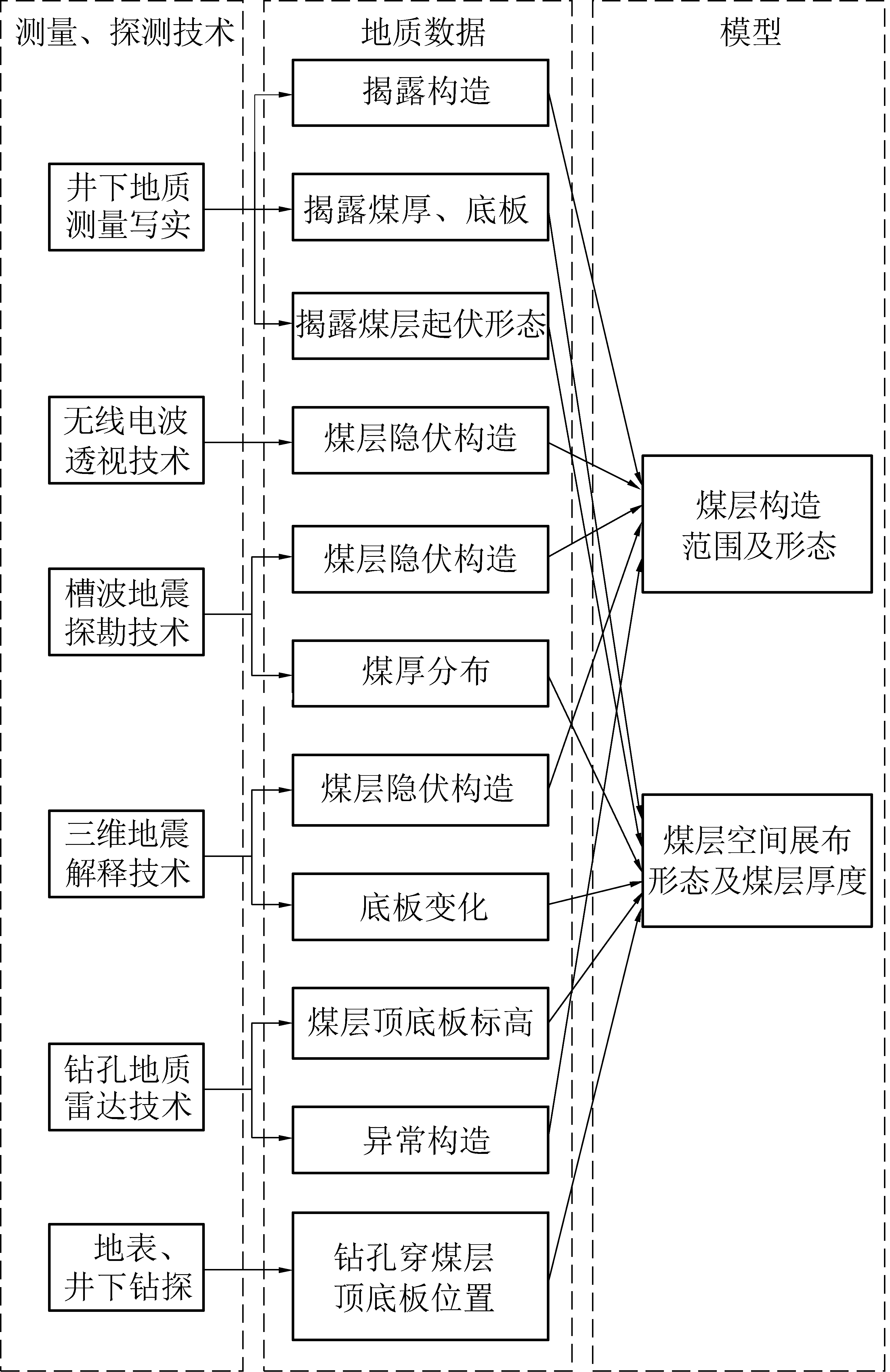 鉴于当前的技术和装备水平现状,亟需采取新的技术路径,才能解决当前智能控制水平低、自主分析决策能力差等问题。因此,黄陵矿业公司开展了“基于透明地质大数据智能精准开采”的技术研究与探索。通过地面钻探、井下钻探、巷道测量与写实、槽波勘探等物探手段来构建透明工作面三维初始模型模型;再联合应用惯性导航技术、雷达定位技术和大数据分析决策技术修正模型,实现工作面前方范围的地质透明;最后通过井下精准控制中心完成了对采煤机和液压支架的精准控制。
