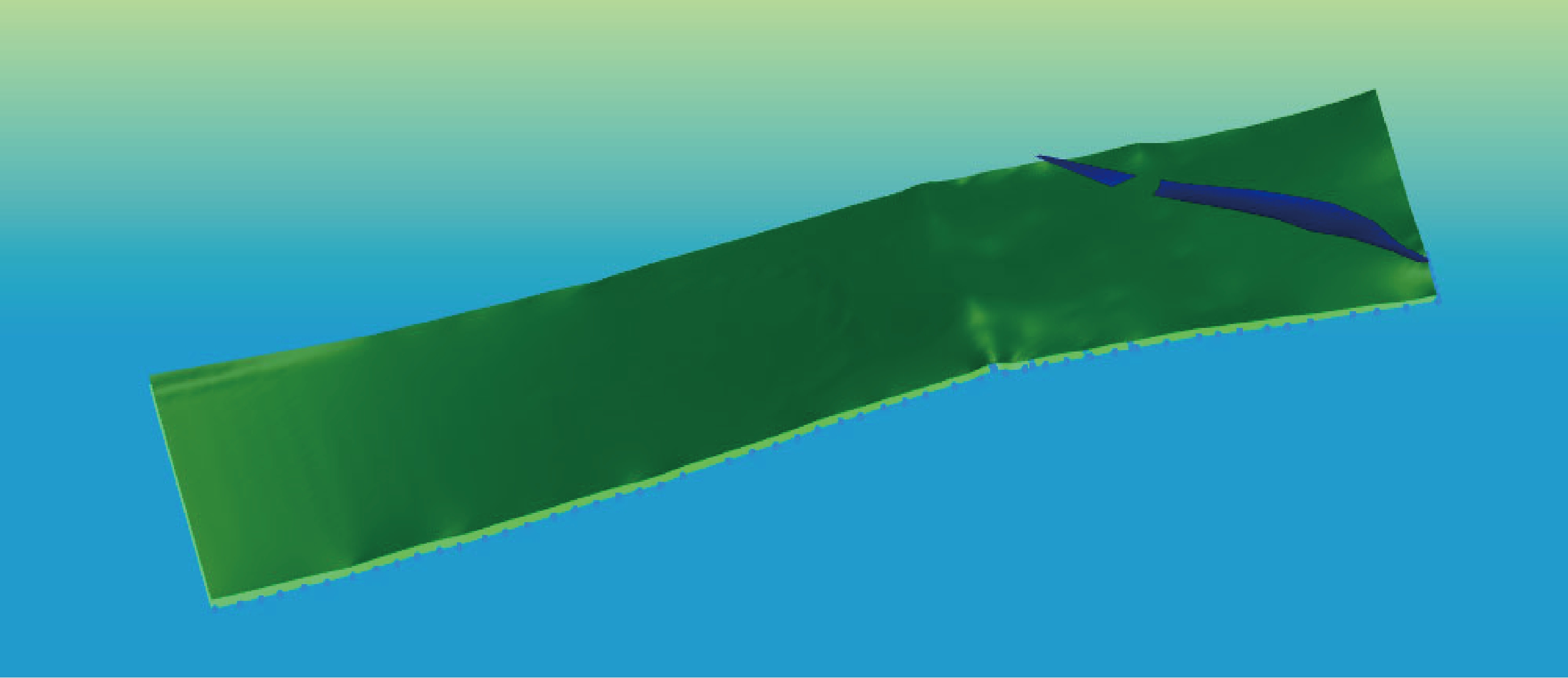整合工作面地质探测工程资料,采用中煤科工集团西安研究院有限公司TIM-3D建模软件构建工作面初始静态模型,如图3所示。模型中蓝色部分表示槽波地震勘探预测的煤层中砂岩冲刷带。结合回采剖面实证,与预测范围相差不大,剖面砂岩冲刷体如图4所示。