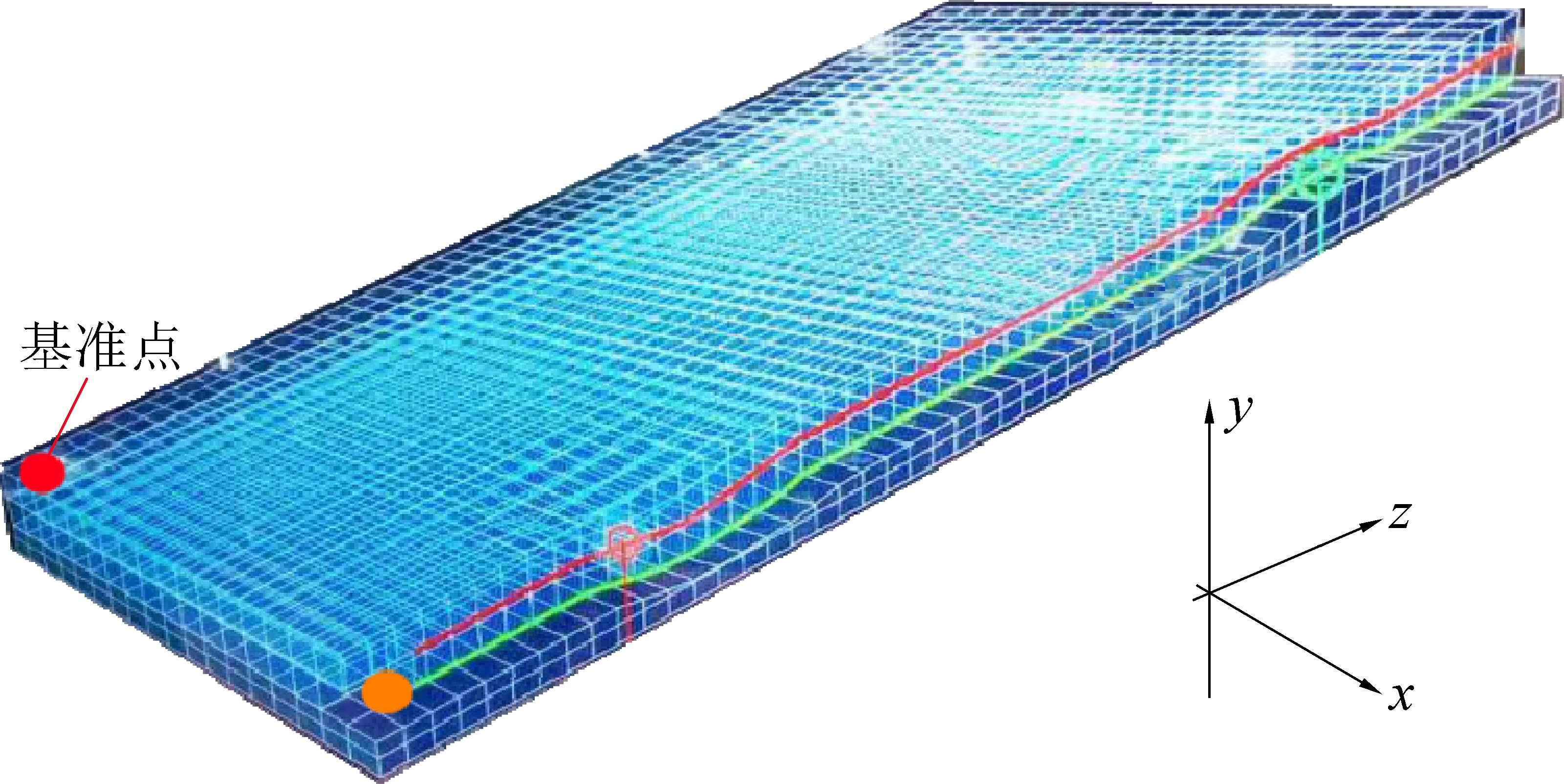 2)工作面地质模型自动切割技术。利用透明工作面数字孪生系统,结合当前工作面的位置,在地质模型中切割出煤层的顶底板曲线,得到20 cm等间隔点的俯仰角、倾角、采高等信息。模型切片示意如图5所示。结合激光雷达技术测得巷道两侧的推进距离,进一步确定当前回采剖面的位置;在采煤机上安装惯性导航系统,实时记录采煤机横滚角、航向角俯仰角等姿态信息;通过采煤机摇臂采高传感器获得当前剖面的采高。通过以上数据可以实时定位当前切片完整的位置、姿态和采高等地质信息。整合当前切片地质数据,重新导入地质模型当中,可实现模型的动态更新。结合回采实测煤厚数据对模型精度进行了评定,结果表明:工作面前方8 m范围内平均绝对误差小于15 cm,15 m范围内平均绝对误差小于30 cm,基本可满足1天智能化开采的任务量。