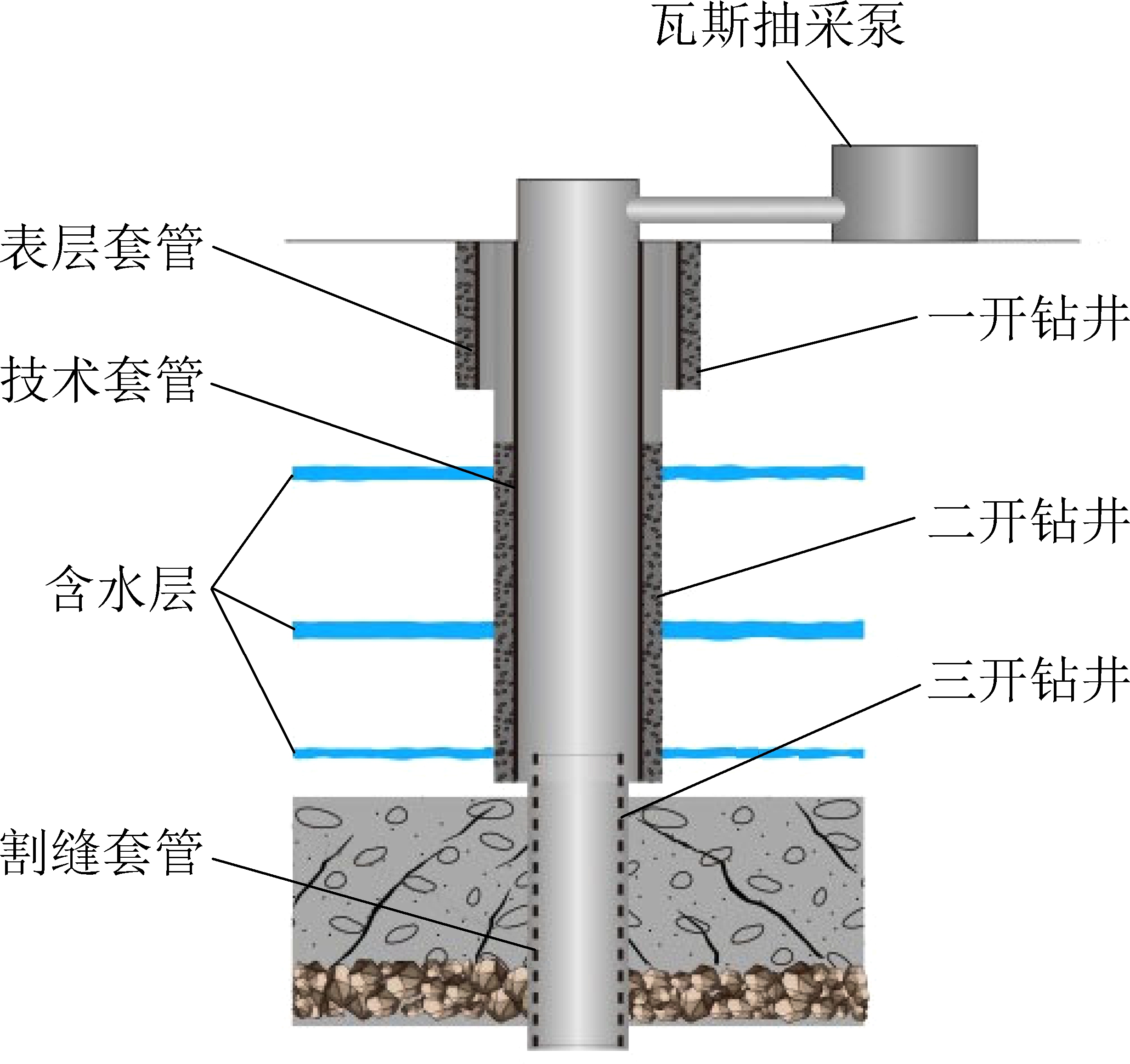 传统煤层气井的井身结构是在上覆岩层未受开采扰动的条件下设计的,并不适用于煤矿采空区钻井。针对采空区上部岩体裂隙发育特征,需专门设计新型井身结构。为有效解决采空区上部含水层涌水对钻井井身稳定性及抽采效果的影响,经过综合比较,并进行现场钻井试验,将采空区煤层气抽采井身结构由二开优化为三开结构,二开固井封闭裂隙带上部含水层,三开下入割缝套管护壁,井身结构如图5所示。