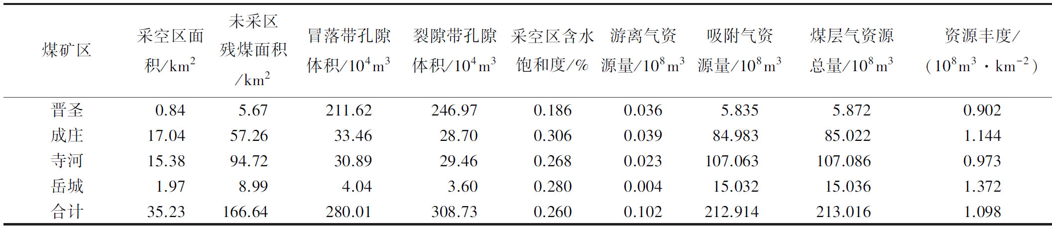 煤矿区采空区面积/km2未采区残煤面积/km2冒落带孔隙体积/104m3裂隙带孔隙体积/104m3采空区含水饱和度/%游离气资源量/108m3吸附气资源量/108m3煤层气资源总量/108m3资源丰度/(108m3·km-2)晋圣0.845.67211.62246.970.1860.0365.8355.8720.902成庄17.0457.2633.4628.700.3060.03984.98385.0221.144寺河15.3894.7230.8929.460.2680.023107.063107.0860.973岳城1.978.994.043.600.2800.00415.03215.0361.372合计35.23166.64280.01308.730.2600.102212.914213.0161.098