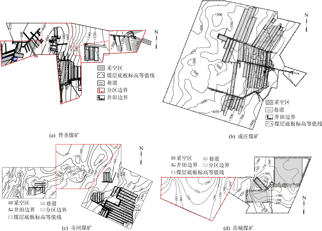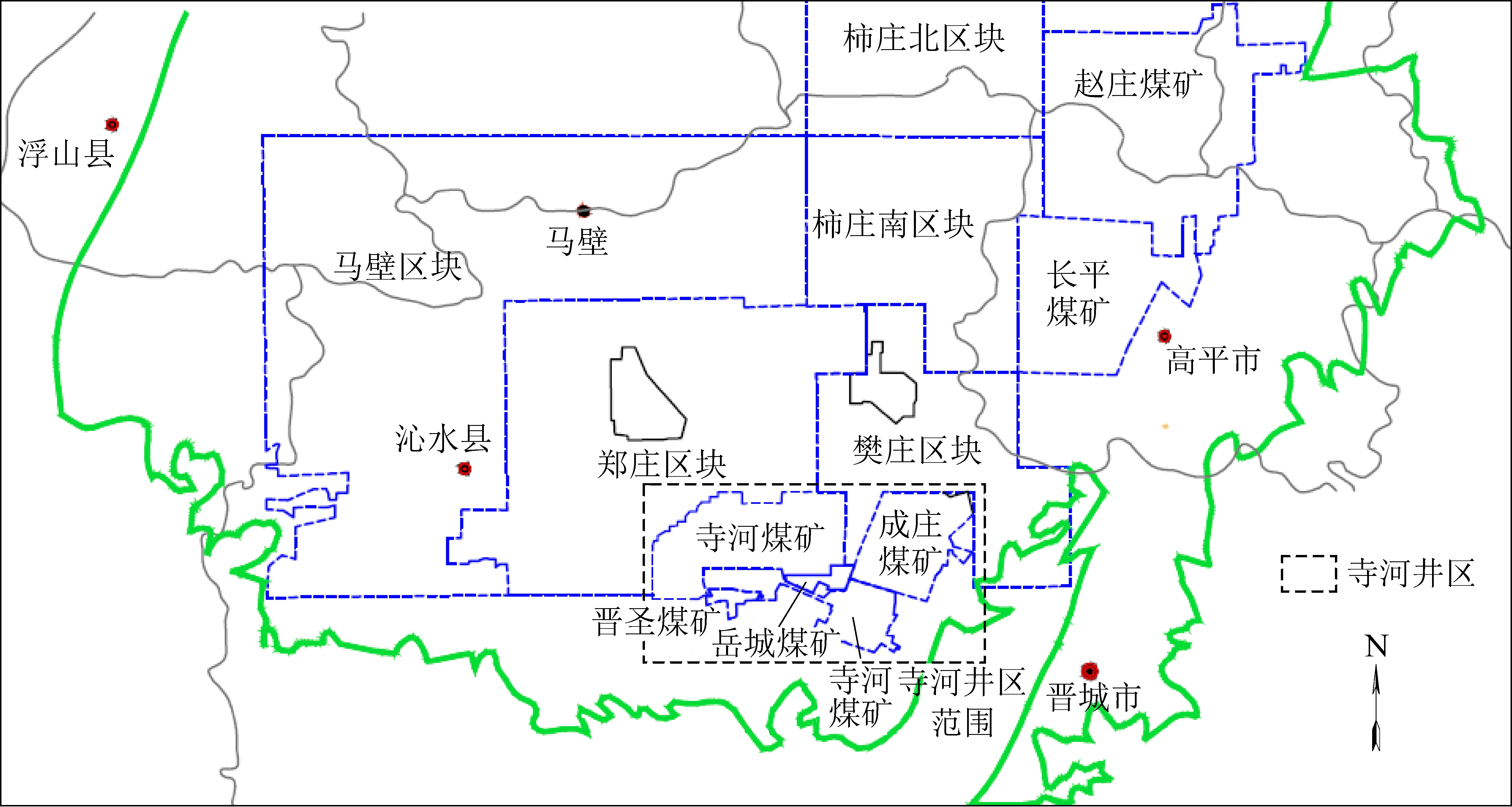 晋城矿区位于沁水盆地南部,煤系为石炭二叠系,主要可采煤层有3层,由浅至深为二叠系的3#煤层、石炭系的9#煤层和15#煤层,可采煤层总厚约13.5 m,主要可采煤层煤是低灰、低硫、高发热量的优质无烟煤。矿区煤炭资源丰富,煤层含气量高,是目前我国煤层气勘探开发程度最高的区域。晋煤集团是全国 520 家重点企业之一, 拥有 6 对生产矿井, 核定生产能力为 3 060 万 t, 拥有当今世界先进的采矿设备、现代化的分选加工系统, 是我国重要的优质无烟煤生产基地。晋城矿区典型煤矿分布如图1所示。寺河井区位于晋城矿区南部,其采空区包括晋圣、成庄、寺河和岳城煤矿(图1)。