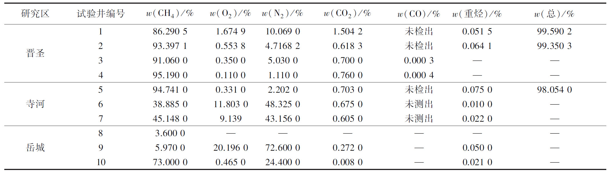 研究区试验井编号w(CH4)/%w(O2)/%w(N2)/%w(CO2)/%w(CO)/%w(重烃)/%w(总量)/%晋圣186.290 51.674 910.069 01.504 2未检出0.051 599.590 2293.397 10.553 84.7168 20.618 3未检出0.064 199.350 3391.060 00.350 05.030 00.700 00.000 3——495.190 00.110 01.110 00.760 00.000 4——寺河594.741 00.331 02.202 00.703 0未检出0.075 098.054 0638.885 011.803 048.325 00.675 0未测出0.010 0—745.148 09.13943.156 00.605 0未测出0.022 0—岳城83.600 0——————95.970 020.196 072.600 00.272 0—0.050 0—1073.000 00.465 024.400 00.008 0—0.021 0—