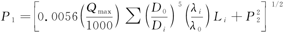 式中:P1为供氯压力,MPa;Qmax为最大输氮流量,m3/h;D0为基准管径,150 mm;Di为实际输氮管径,97.18 mm;λi为实际输氮管径的阻力损失系数,根据钻井实际,取值0.029;λ0为基准管径的阻力损失系数,取值0.026;Li为相同直径管路的长度,0.508 07 km;P2为管路末端的绝对压力,0.2 MPa。