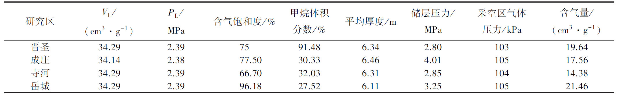 研究区VL/(cm3·g-1)PL/MPa含气饱和度/%甲烷体积分数/%平均厚度/m储层压力/MPa采空区气体压力/kPa含气量/(cm3·g-1)晋圣34.292.397591.486.342.8010319.64成庄34.142.3877.5030.336.464.0110517.56寺河34.292.3966.7032.036.312.8510414.38岳城34.292.3996.1827.526.113.2510521.46