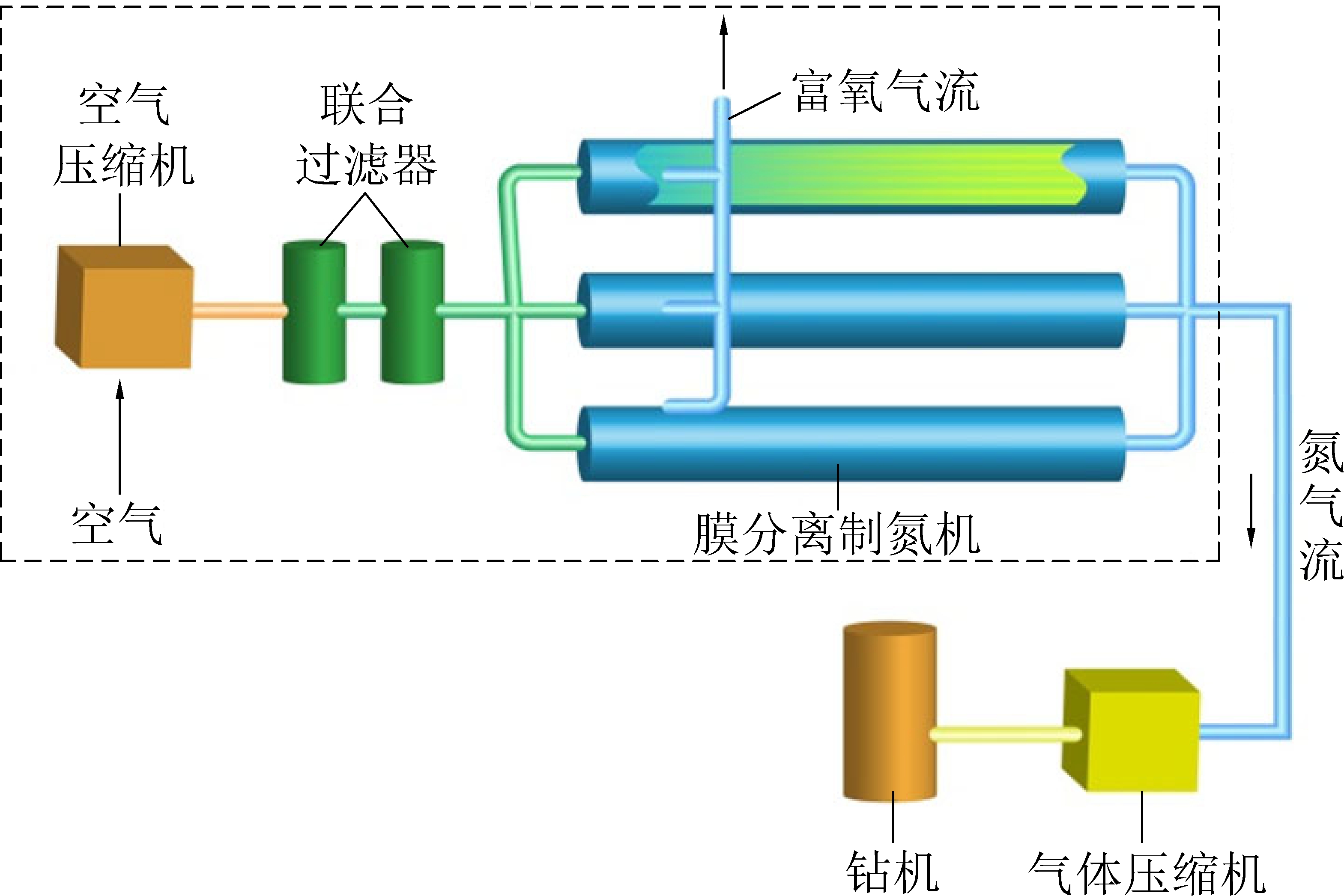 三开氮气钻井工艺如图6所示,使用膜制氮设制备工业氮气,通过压缩机将氮气压入钻杆中。分段式的工艺设计,在大规模钻井时,可合理安排每口钻井的钻进时段,此模式下不需为每台钻机配备膜制氮设备,可提高膜制氮设备的使用效率。