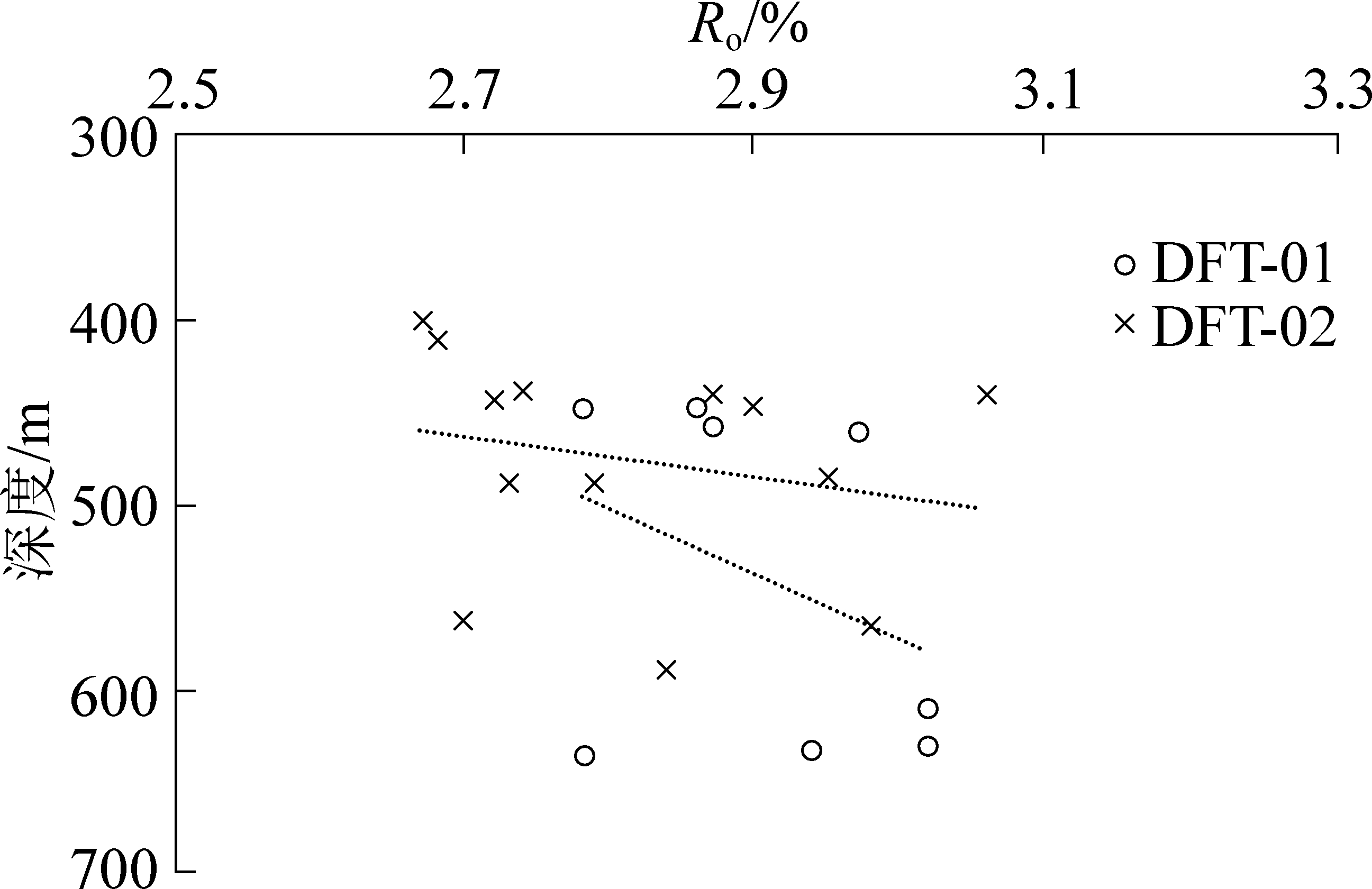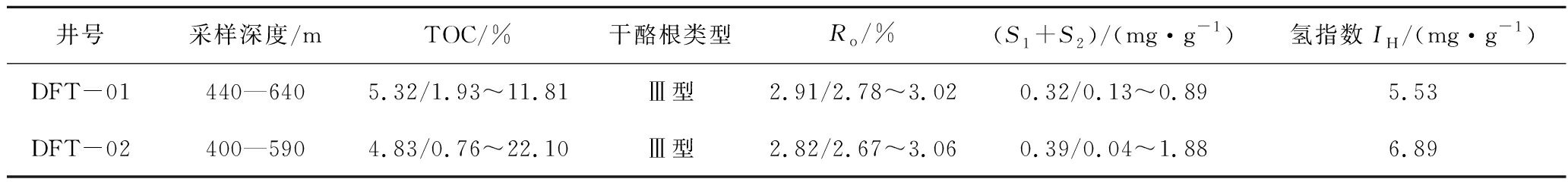 井号采样深度/mTOC/%干酪根类型Ro/%(S1+S2)/(mg·g-1)氢指数IH/(mg·g-1)DFT-01440—6405.32/1.93~11.81Ⅲ型2.91/2.78~3.020.32/0.13~0.895.53DFT-02400—5904.83/0.76~22.10Ⅲ型2.82/2.67~3.060.39/0.04~1.886.89