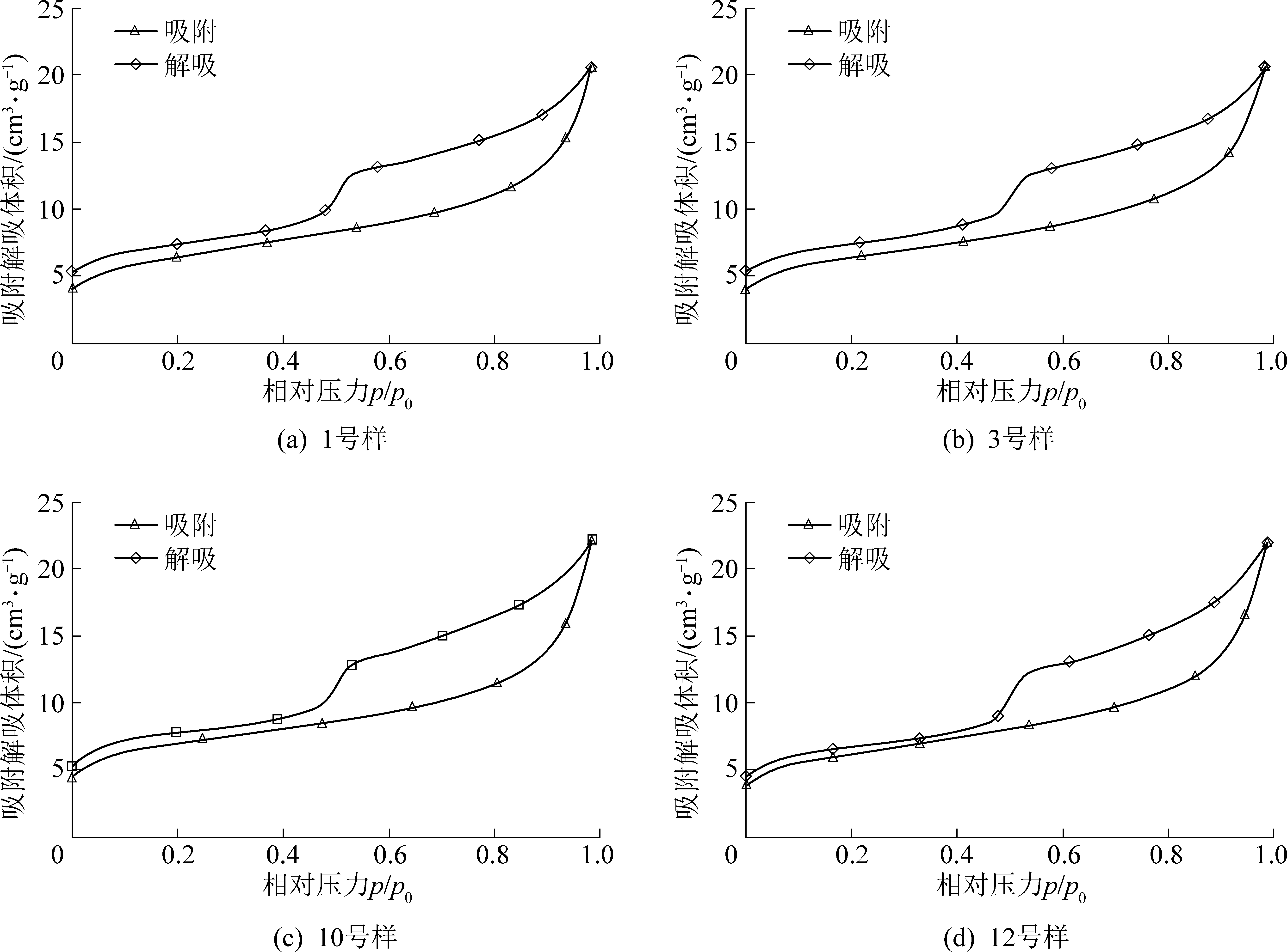 氮气吸脱附测试分析结果显示,区内龙潭组泥页岩不同样品间吸脱附曲线有所差异,但总体呈现相同的反S型特征(图7)。吸附曲线在p/p0=0.05~0.10出现拐点达到单分子层饱和吸附量,p/p0=0.1~0.8内表现出相对平缓上升、向上凸起的形态;在相对高压区吸附质发生毛细管凝聚,在p/p0>0.8的高压区吸附曲线快速上升;脱附曲线在p/p0>0.5区间呈现快速下降的特征,下降幅度小于吸附曲线,在0.4<p/p0<0.5出现突然下降的拐点,在p/p0<0.4表现出与吸附一致的特征,近似形成滞后回环。总体上反映出泥页岩孔隙主要为开放型的纳米级孔隙,有利于泥页岩中气体的吸附、储集和运移。