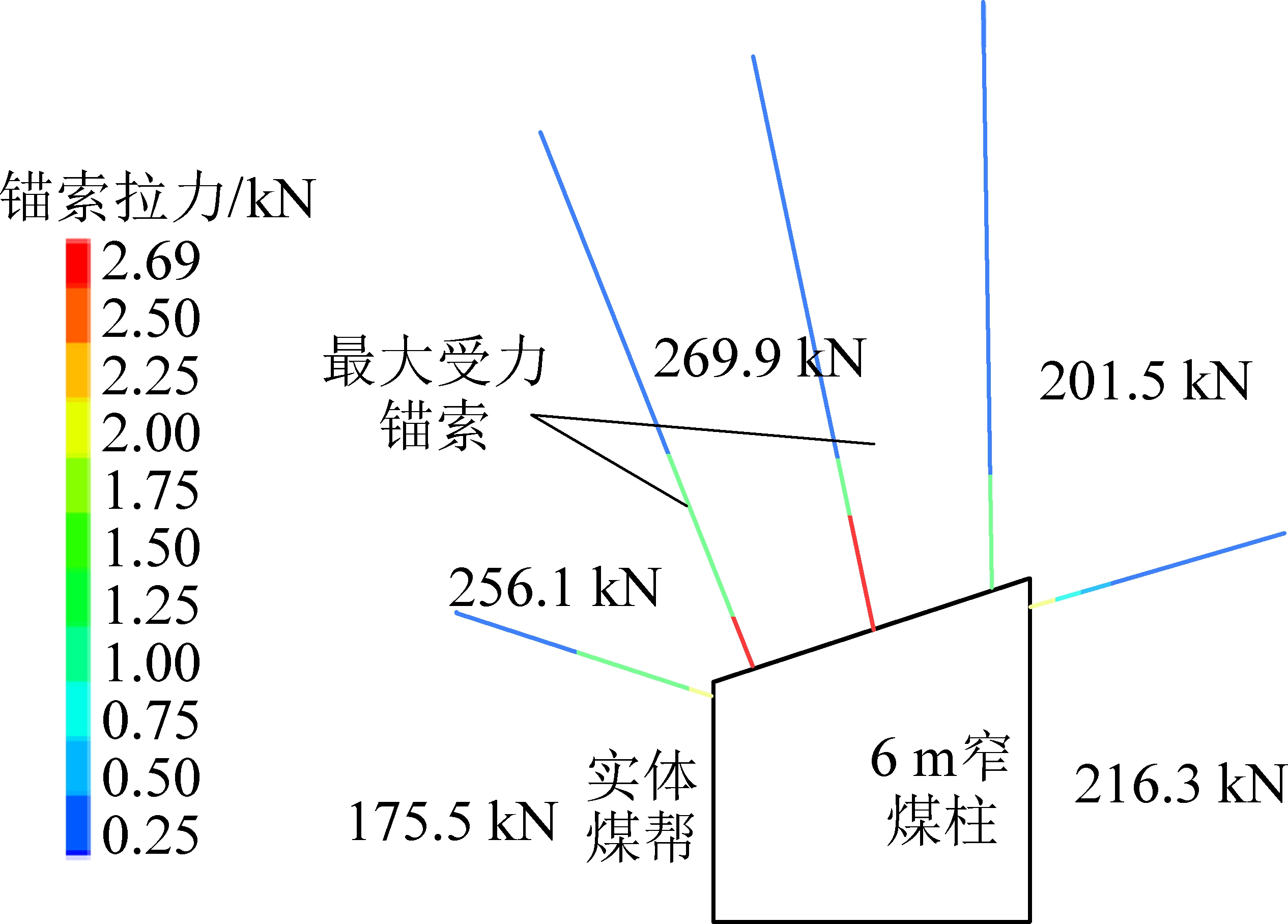由图12岩体变形趋势可知,异型断面回风巷不仅在实体煤帮和6 m煤柱之间存在相对位移变形,并在回风巷顶板和窄煤柱之间也发生了相对变形(图12中箭头),回风巷顶板和窄煤柱间夹角会变小(图12中圈),以顶板夹角为中心,离夹角位置越远的岩体变形也会增大。因此,回风巷顶部第1排锚索和第2排锚索对应岩体的变形趋势比第3排大,6 m窄煤柱从上往下数第2排和第3排锚杆对应岩体的变形趋势比第1排大,相应锚杆和锚索受力也会更大。