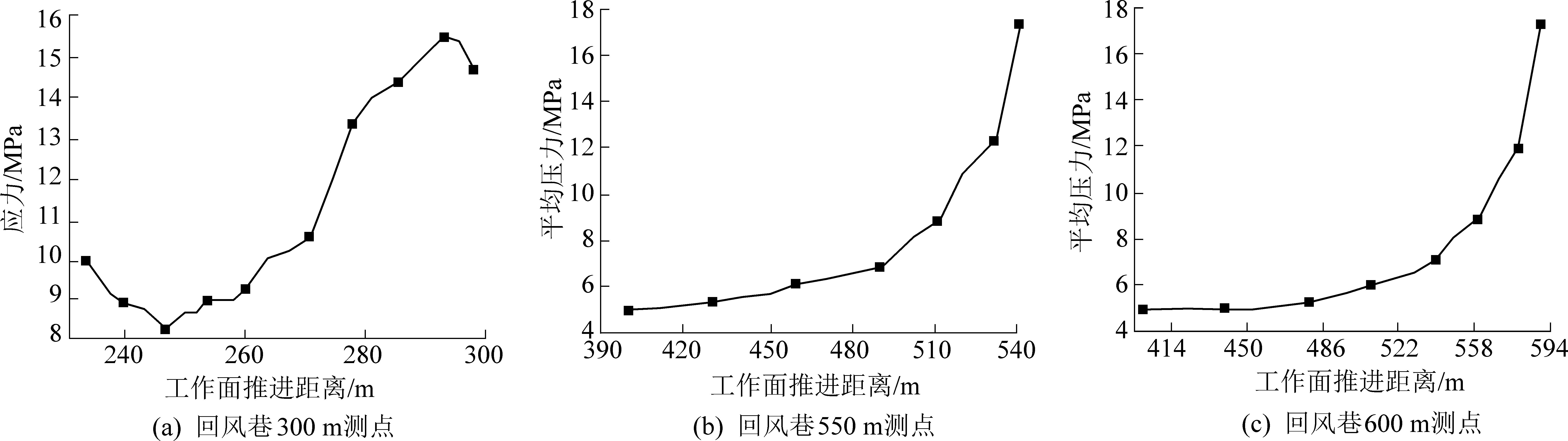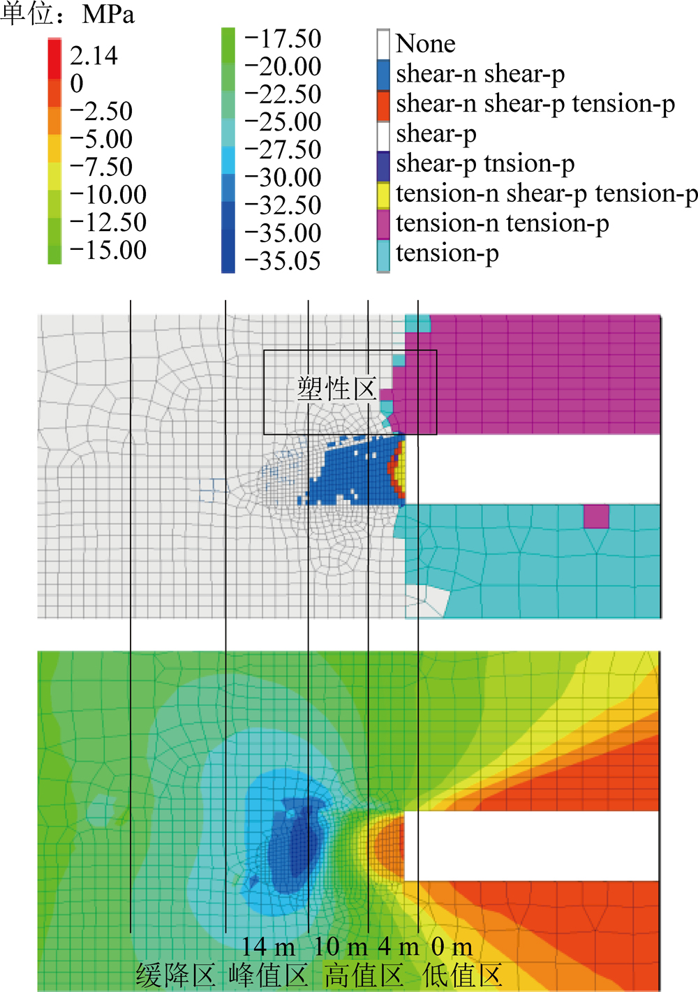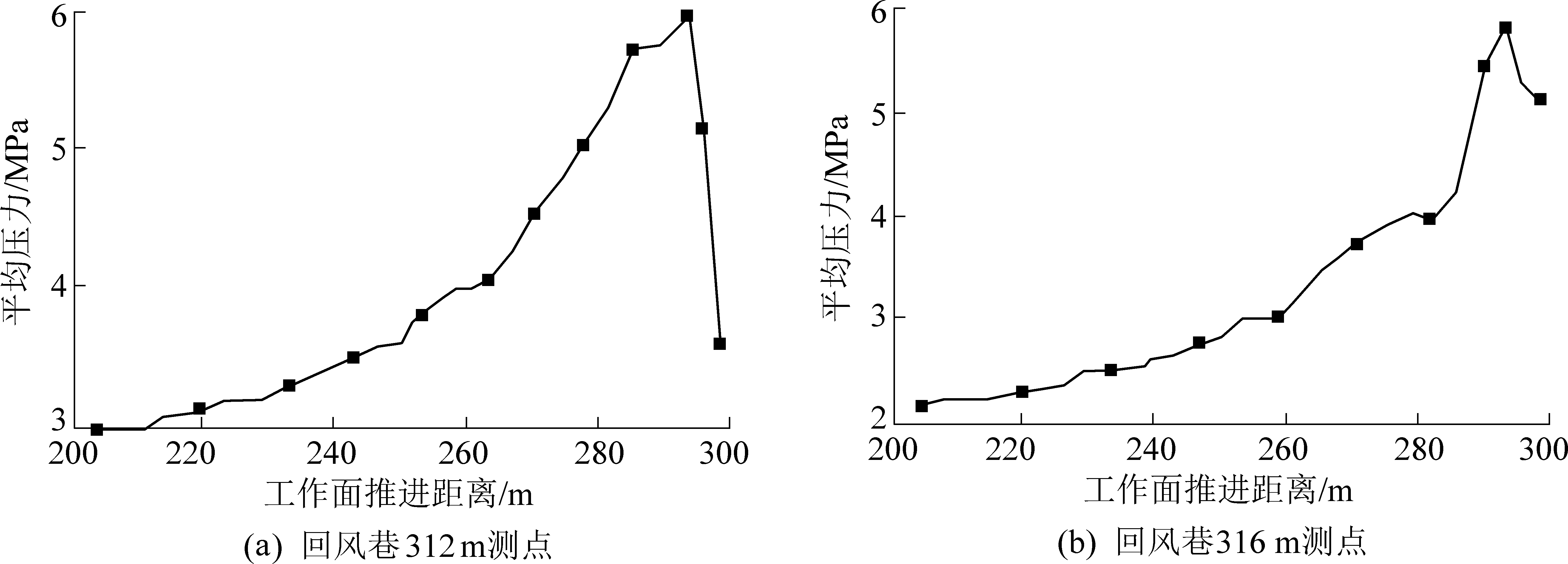 回采期间工作面超前0~4 m为塑性区、低应力区;4~10 m为塑性区、高应力区;10~14 m为应力峰值区;其后14~45 m为应力高值区、缓降区。