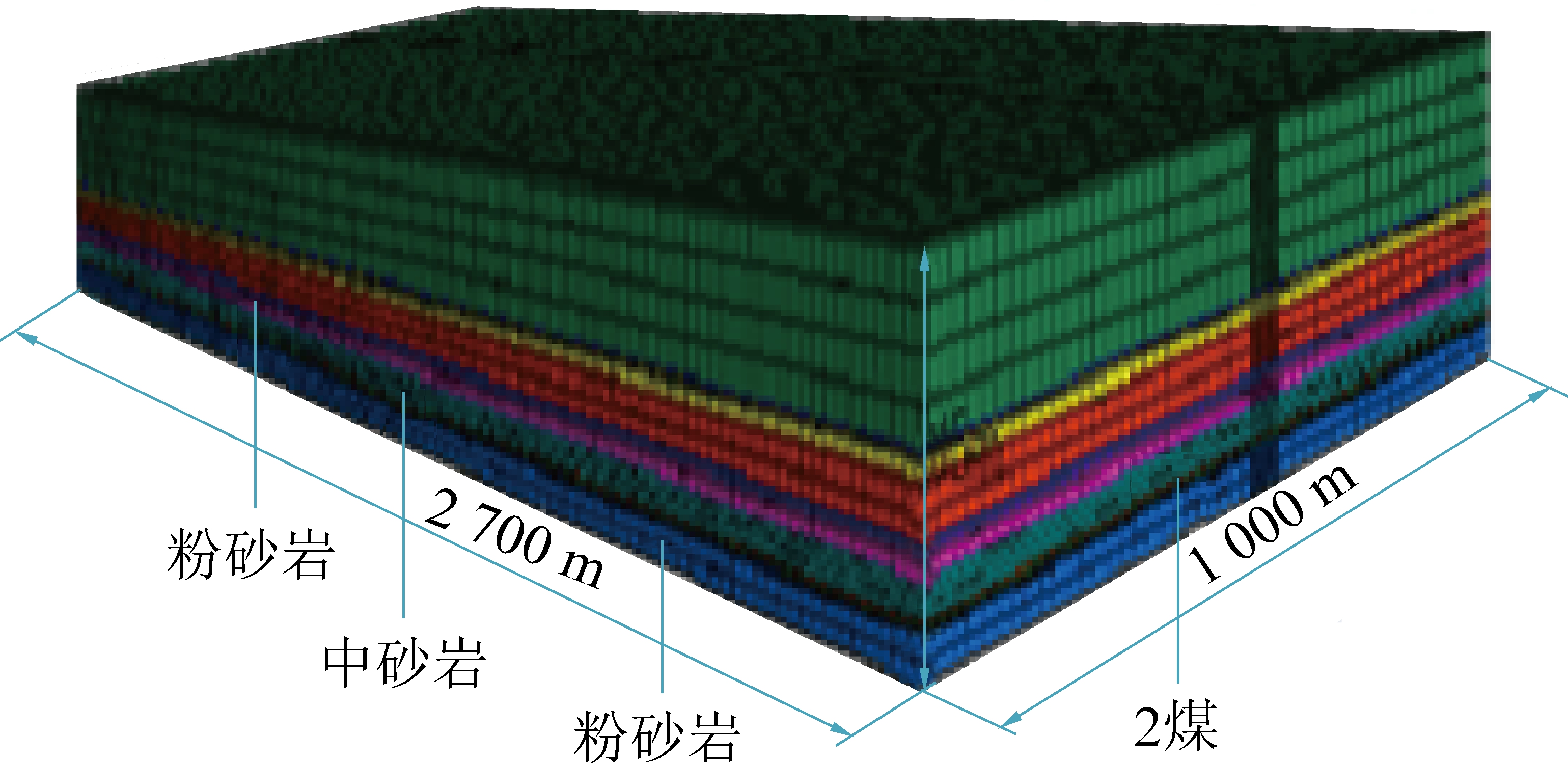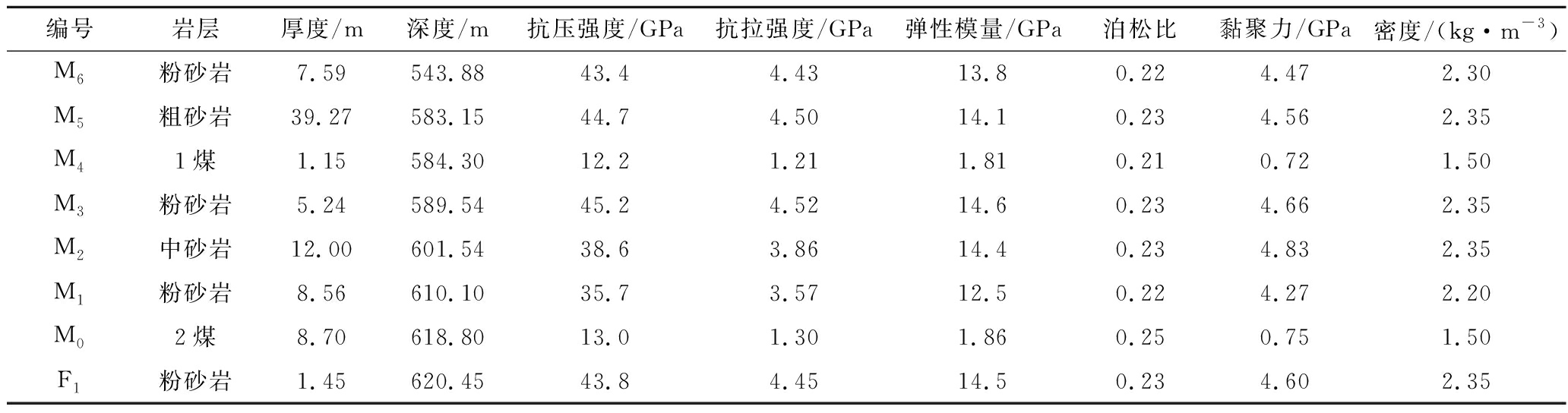 编号岩层厚度/m深度/m抗压强度/GPa抗拉强度/GPa弹性模量/GPa泊松比黏聚力/GPa密度/(kg·m-3)M6粉砂岩7.59543.8843.44.4313.80.224.472.30M5粗砂岩39.27583.1544.74.5014.10.234.562.35M41煤1.15584.3012.21.211.810.210.721.50M3粉砂岩5.24589.5445.24.5214.60.234.662.35M2中砂岩12.00601.5438.63.8614.40.234.832.35M1粉砂岩8.56610.1035.73.5712.50.224.272.20M02煤8.70618.8013.01.301.860.250.751.50F1粉砂岩1.45620.4543.84.4514.50.234.602.35