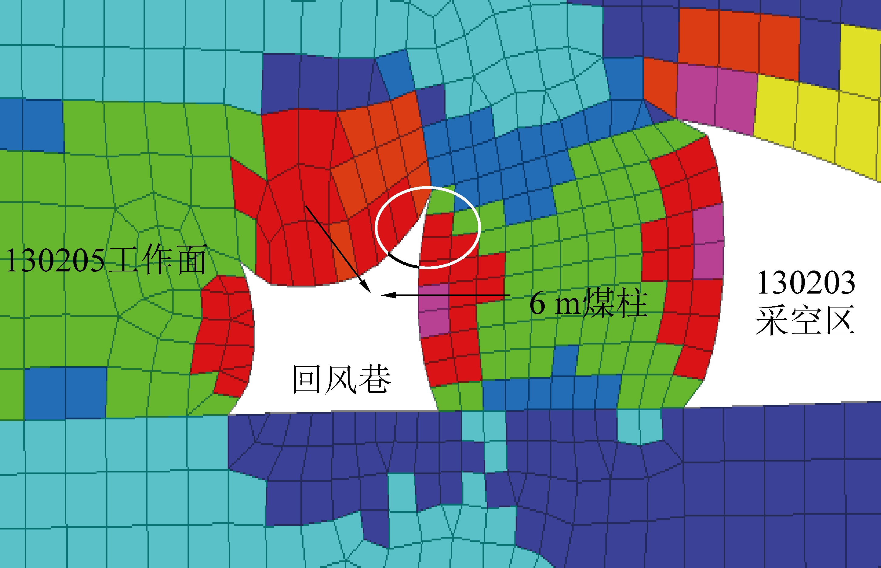 为验证模型及力学参数的正确性,建立与煤柱宽度同样6 m的数值模型(图5),当留设的煤柱尺寸合理时,在掘进巷道时,煤柱可以发挥一定的承载力,不易发生失稳,主要可以维持巷道围岩的稳定性。因此要考虑相邻工作面在回采期间对煤柱的影响,为此,基于数值模拟方法,开展6 m窄煤柱沿空掘巷支承压力分析与支护设计研究。130205工作面回采期间超前压力分析,如图6所示。
