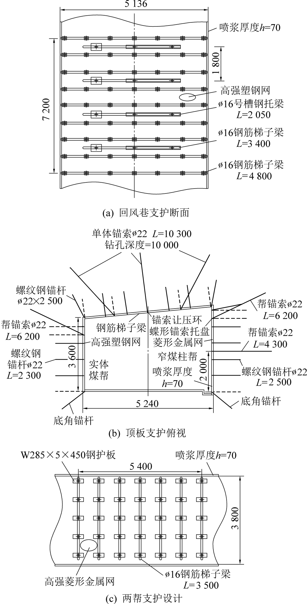 回风巷巷道断面为异型断面,巷道窄煤柱帮高4.2 m、实体煤帮高3.6 m、巷道宽度5.24 m。巷道顶板锚索采用ø22 mm×10 300 mm钢绞线锚索,每根锚索充填4节ø23 mm×700 mm的树脂药卷(其中2节超快,2节快速),锚索托板采用300 mm×300 mm×16 mm拱形托板。顶板使用2号-M24-2 500 mm-BHRB500号螺纹钢锚杆,每根锚杆充填2节ø23 mm×700 mm的树脂药卷,帮部使用20#-M22-2 300 mm-BHRB500号成套螺纹钢端头锚杆,每根锚杆充填2节ø35 mm×350 mm的树脂药卷。顶锚杆使用一条与巷道断面相符的圆钢钢带(由ø16 mm圆钢加工而成),帮锚杆使用一块W280-450-5 mm钢护板,顶部挂金属网,网孔尺寸为150 mm×150 mm,网片规格为6 000 mm×1 000 mm;帮上挂塑钢网(网孔尺寸为50 mm×50 mm,网片规格为4 000 mm×1 000 mm),帮上连网采用隔扣相联的方式进行联网。回风巷支护断面如图9所示。