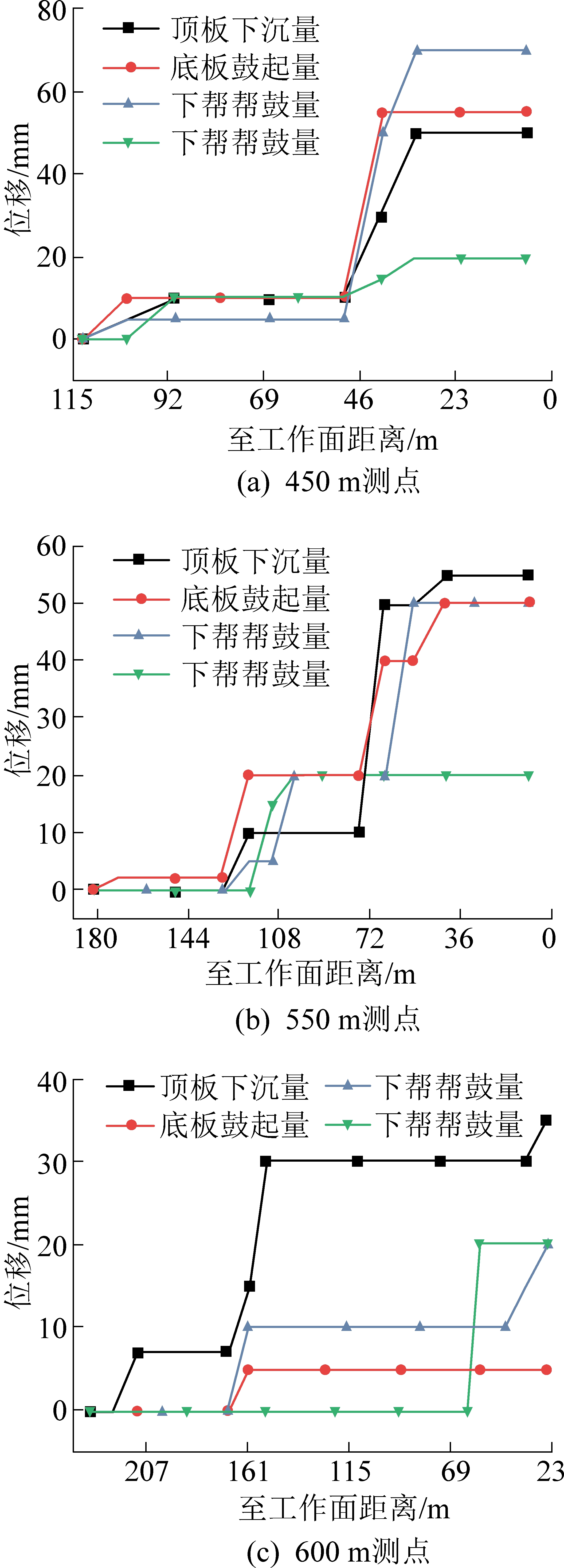 在回风巷道共布置3组测站对围岩移近量进行观测,每个测站分别设备1个监测断面 (每个断面间隔50 m),如图13所示。回风巷道围岩移近量与工作面推进距离关系曲线(图14)。测站1距离工作面开切眼为450 m(图14a),测站2距离工作面开切眼为550 m(图14b),测站3距离工作面开切眼为600 m(图14c)。