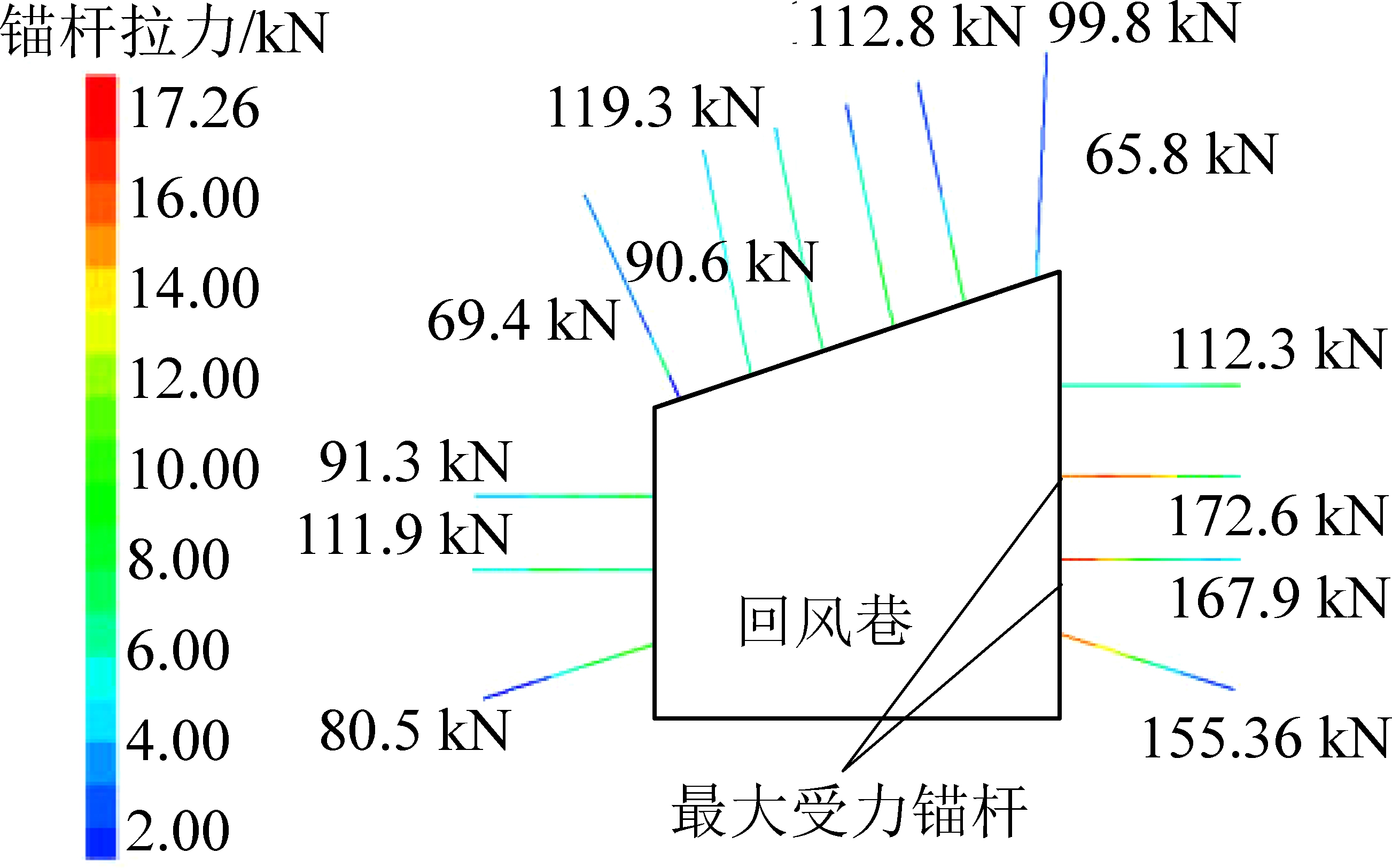 锚索受力分布如图10所示,由图10知,顶板第1排和第2排锚索受力最大,工作阻力最大值为269.9 kN(拉应力为708.23 MPa),锚索在180~270 kN时受力最大,均未超过极限承载能力(400 kN)。锚杆受力分布如图11所示,在二次动压影响下,锚杆最大工作阻力为172.6 kN(锚杆最大拉力200 kN)。6 m窄煤柱侧锚杆工作阻力大于实体煤帮侧的锚杆,最大受力锚杆分别是6 m窄煤柱从上往下数第2排和第3排。以上分析表明,最大受力锚索是回风巷顶部第1排和第2排。最大受力锚杆分别是6 m窄煤柱从上往下数第2排和第3排。支护结构最大受力发生在这2个部位的根本原因是受到岩体变形趋势的影响。