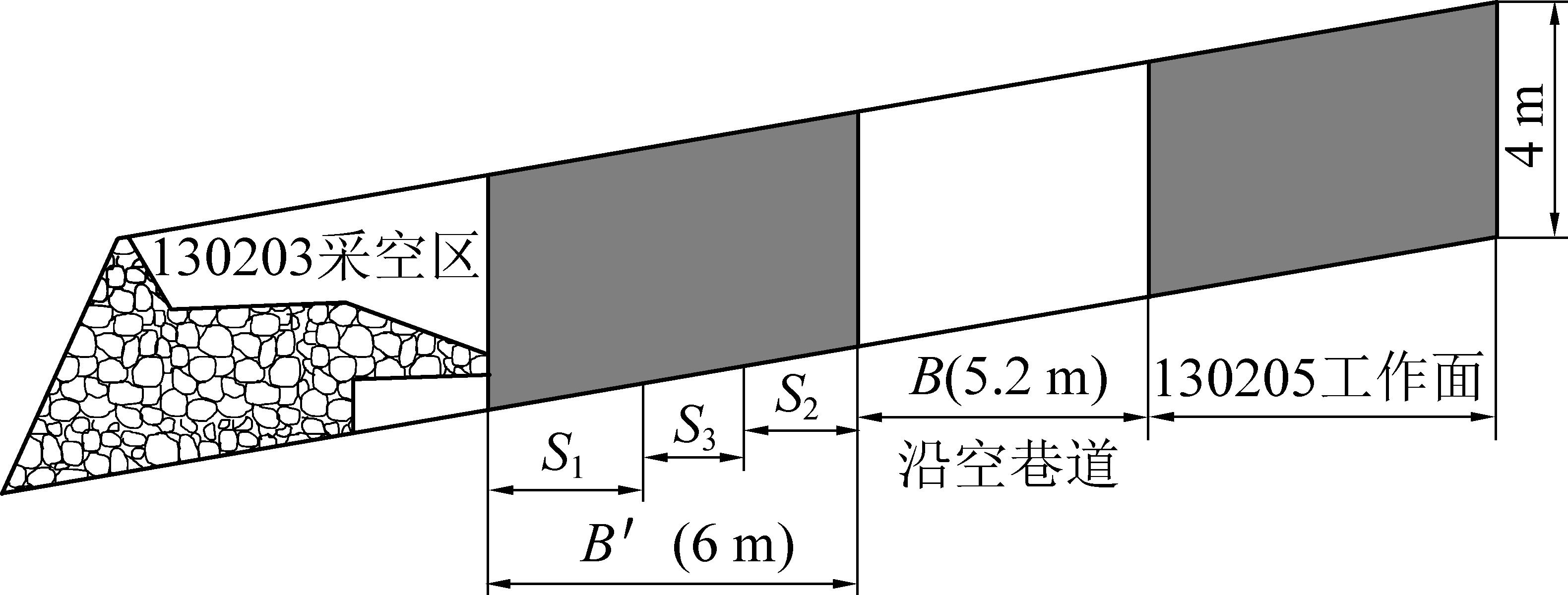 式中:S1为本区段沿空掘巷窄煤柱内产生的破碎区宽度;S2为帮锚杆的有效长度(增加15%的补强加固系数);S3=(S1+S2)×15%,增加煤柱稳定性系数。