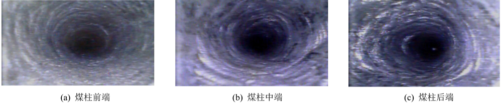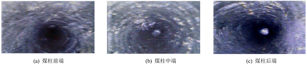 根据观测图18可见,未注浆的孔内裂隙发育,尤其是孔的两端头,煤体破碎。孔壁在探头照射下呈现亮黑色。注浆孔内裂隙小,部分闭合。比较注过浆的孔,孔的中部核心区域注浆效果明显,孔壁光滑,呈现发白的颜色。但是,钻孔的两端裂隙仍部分较发育,煤体部分较破碎。建议间隔注浆,尤其是边缘位置。