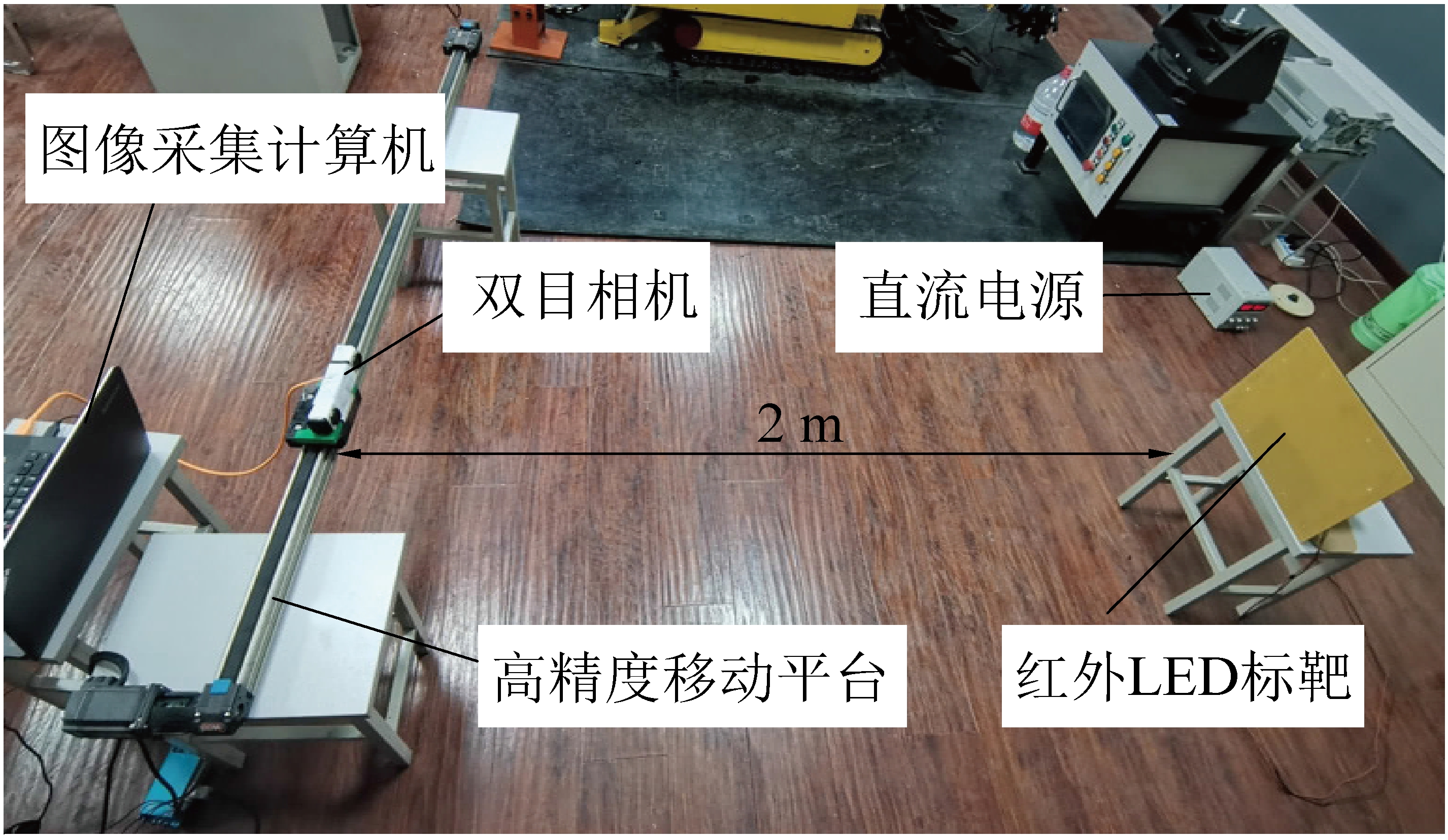 采用MYNTEYE的D1000-IR-120/Color双目相机和SE347-003880 nm红外LED灯组成的被测标靶构成双目视觉位姿测量系统。将加装了红外滤镜的双目相机固定在精度为0.1 mm的高精度移动平台,并将红外LED光源组成的被测标靶固定于机身后方一定距离处。如图16所示是搭建的双目视觉位置测量动态试验平台。