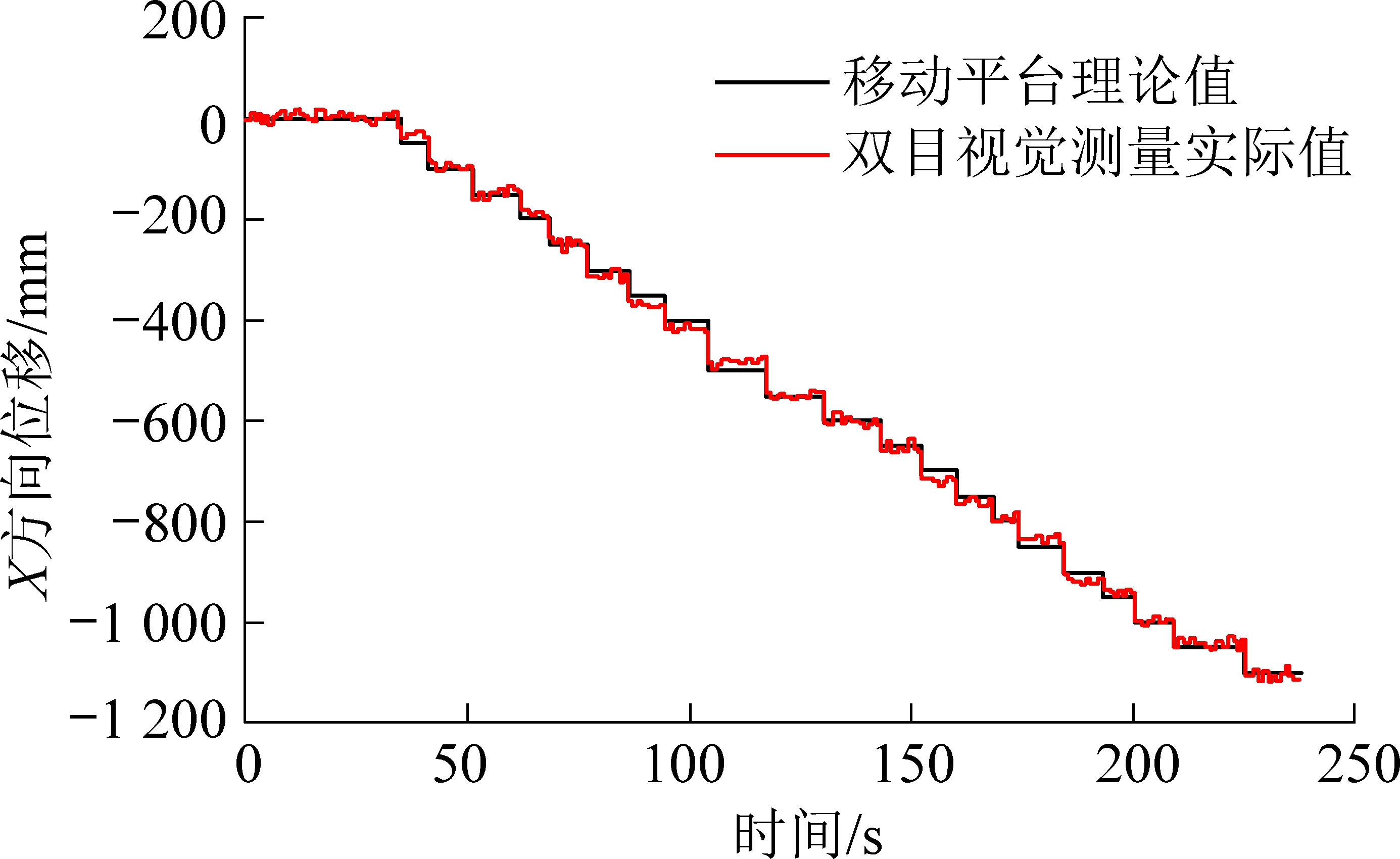 通过调整相机横向位移,每次移动5 cm并利用双目图像采集软件采集固定于机身后方2 m处的红外LED标靶图像。以初始位置(0,0,0)和初始姿态(0°,0°,0°)为起始位姿,得到连续的位姿测量结果。如图17所示是测量距离为2 m时,双目视觉测量方法在X方向的测量结果。