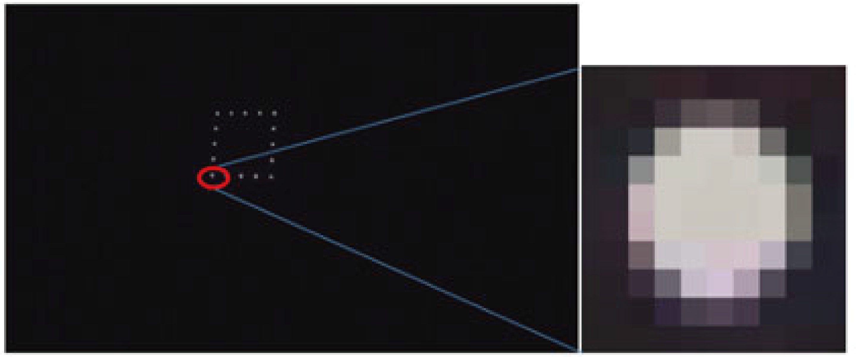 采用红外SE3470灯组成的红外LED标靶作为图像特征,在基于红外LED特征的双目图像中,每个光斑区域具有很强的连通性。红外LED灯的图像特征成像如图6所示,特征点成像近似椭圆,且其灰度值从光斑中心向边缘减小。