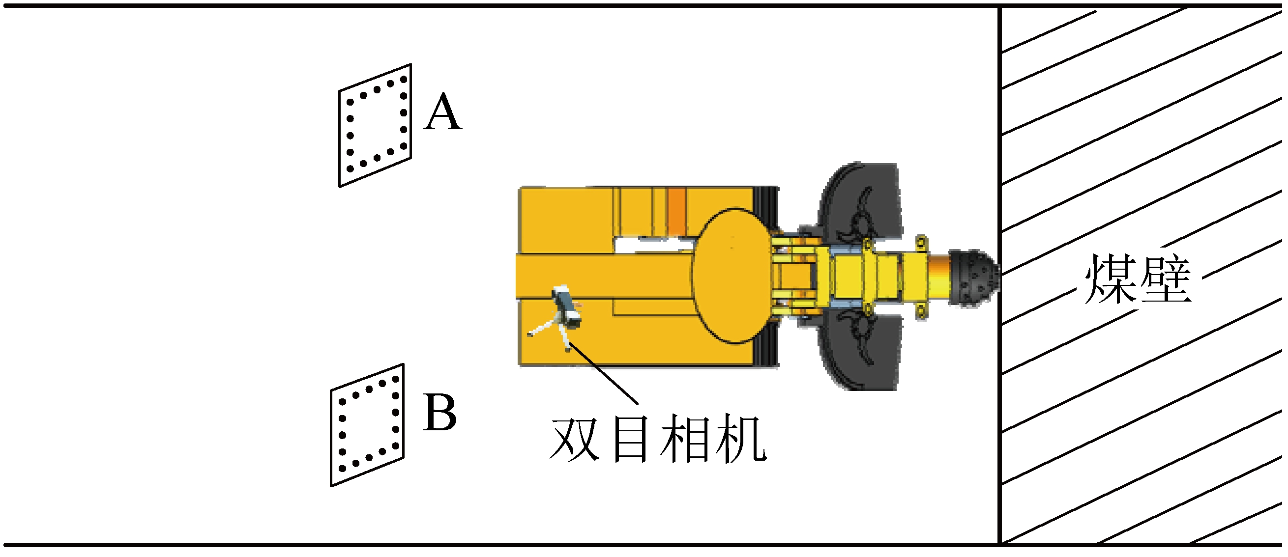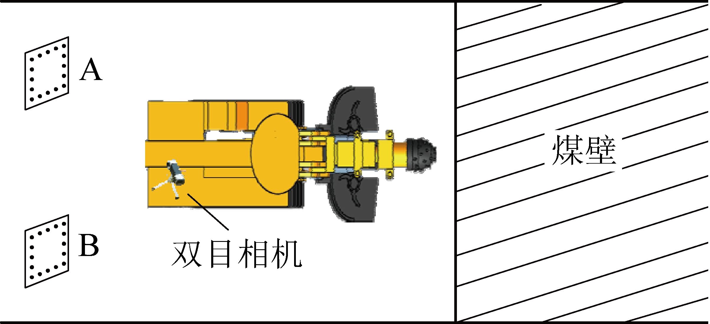 由于双目视觉测量原理自身的不足导致测量距离有限,考虑基于双目立体视觉的悬臂式掘进机位姿测量方法在实际使用中存在标靶移动问题,提出了一种双标靶交叉移动的悬臂式掘进机双目视觉位姿测量使用策略。如图13所示,将双目相机固定在悬臂式掘进机上,通过采集布置在后方的双红外LED标靶A和B的图像实现机身位姿检测的目的。