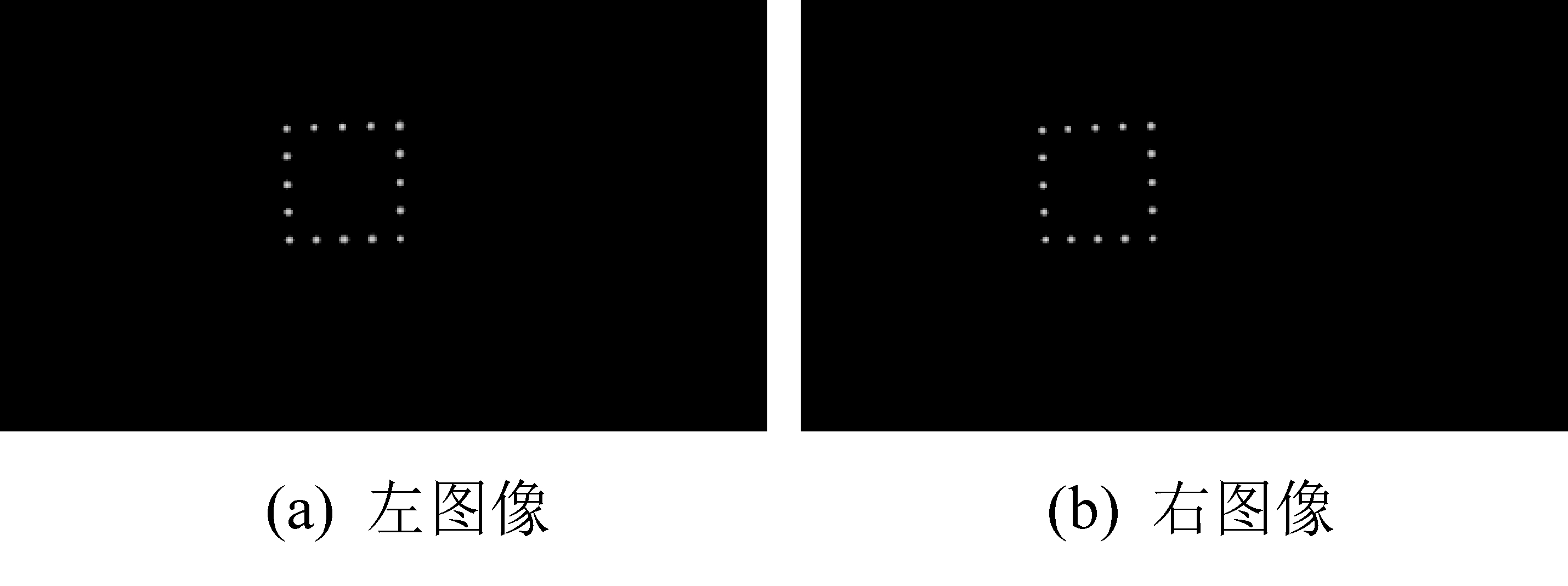 在视觉测量技术中,常用的图像特征有点特征、线特征、图形特征和边缘特征。在煤矿井下巷道掘进中,低照度、高粉尘和机电设备众多且集中等造成图像特征不明显或特征缺失,因此,通过人为构建图像特征的方法可以有效地保证稳定的特征。在研究截割头位姿视觉测量方法[14-15]时采用了一种红外LED灯作为图像特征,有效地避免了杂光的干扰,增加了特征的稳定性,在此基础上,人为构建红外LED标靶作为图像特征。双目相机拍摄的红外LED双目图像如图4所示。