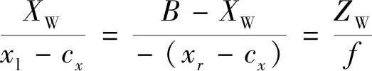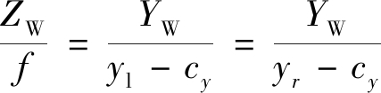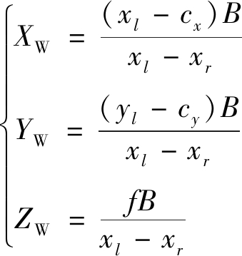 理想情况下双目视觉空间点坐标测量原理如图1所示。双目相机左右视图的成像原点一致、两相机光轴平行及成像平面的极线行对齐[12]。以左相机坐标系为世界坐标系,在空间中有一点P,相对于双目相机的中心的世界坐标为(XW,YW,ZW)。