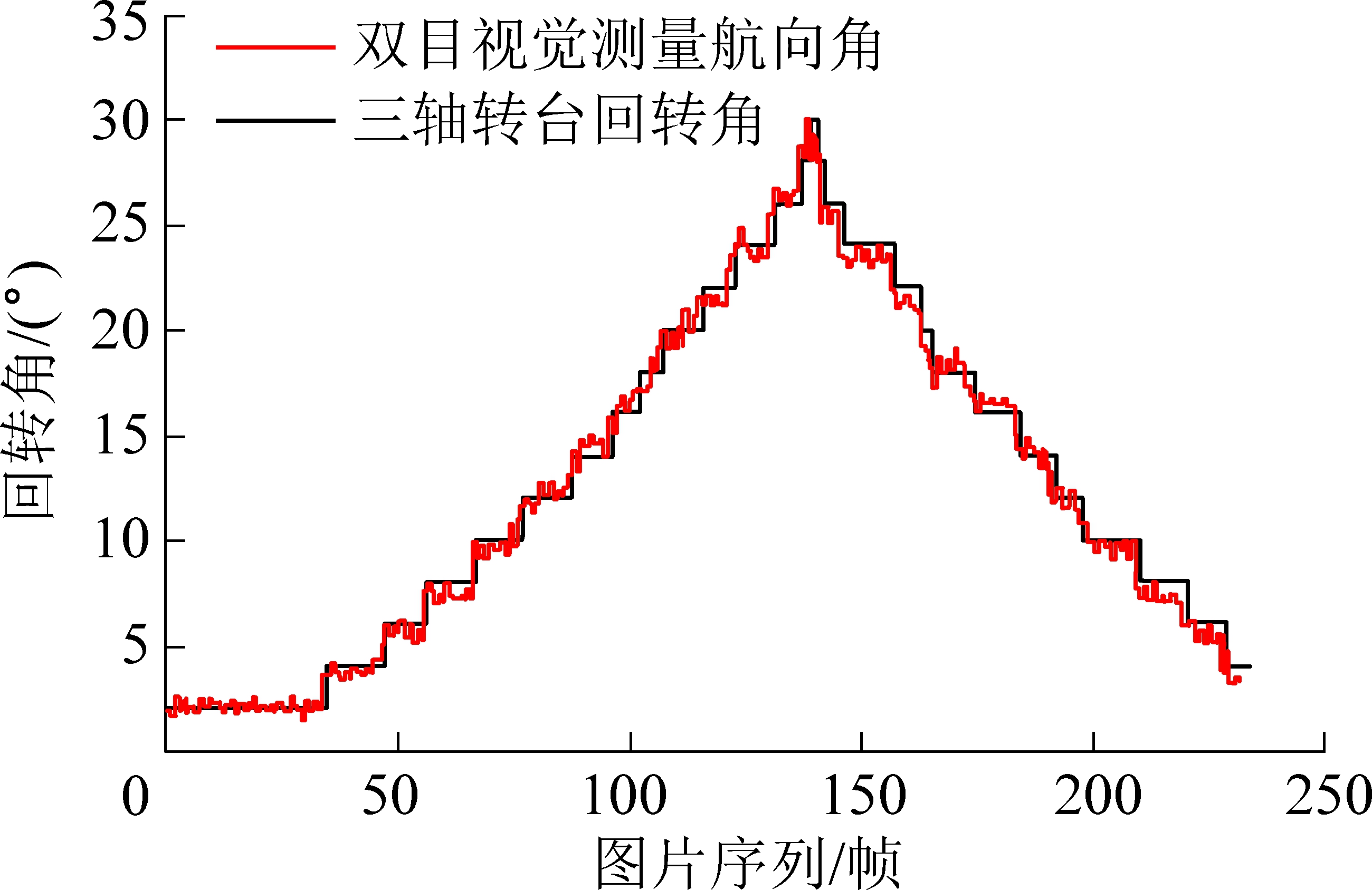 通过旋转双目相机并利用双目图像采集软件采集固定于机身后方2 m处的红外LED标靶图像。如图25所示是高精度三轴转台回转角数据变化情况,图26是通过双目视觉计算得到的航向角数据,可以看出姿态变化情况基本一致。
