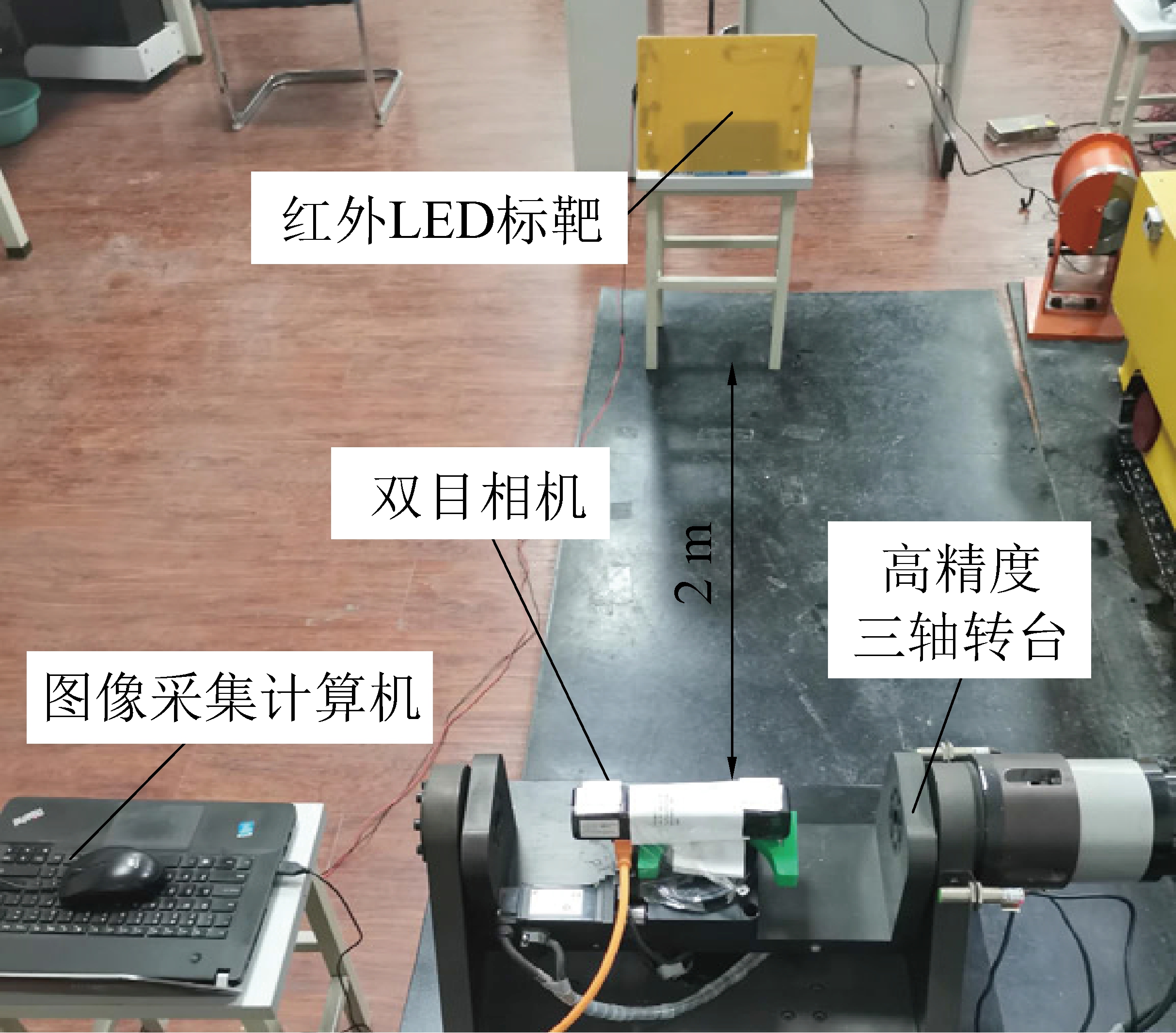 试验器材包括MYEYEN120双目相机,红外LED标靶,精度为0.01°的高精度三轴转台。为便于研究,将双目相机固定在高精度三轴转台,如图24所示。