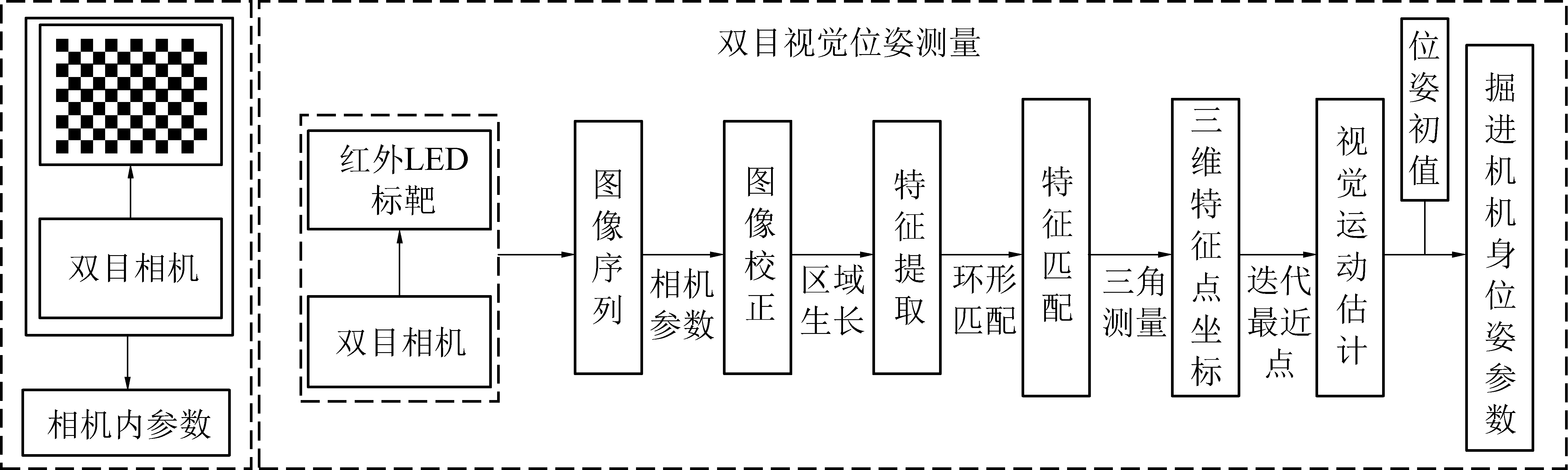 悬臂式掘进机双目视觉位姿测量方案如图3所示。首先采用张正友标定原理对双目相机进行内参数标定,获得两相机内参数和两相机之间的变换矩阵。利用双目相机采集双目图像获得双目图像序列,根据标定得到的参数利用双目校正技术实现双目图像的立体校正,随后利用区域生长的方法实现图像特征分割并采用高斯拟合的方式实现特征的快速精确提取。将前后2帧双目图像进行环形匹配实现双目图像的时域特征匹配,得到获得4组匹配好的特征点组,即2组相邻时刻双目图像特征点。根据前述三角测量原理,结合相机内参数计算得到2组3D空间坐标,最后利用运动估计方法求解机身的运动参数。
