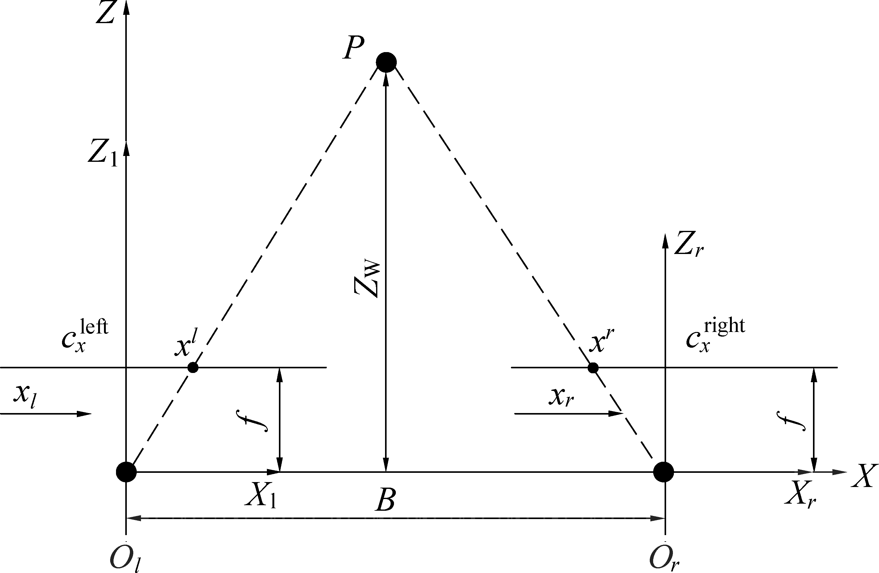 双目相机中左右相机光心分别是Ol、Or,焦距为f,基线距离为B。世界中点P在左右相机成像平面中的成像点为xl(xl,yl)、xr(xr,yr)。在理想状态下左右相机的光心一致,即