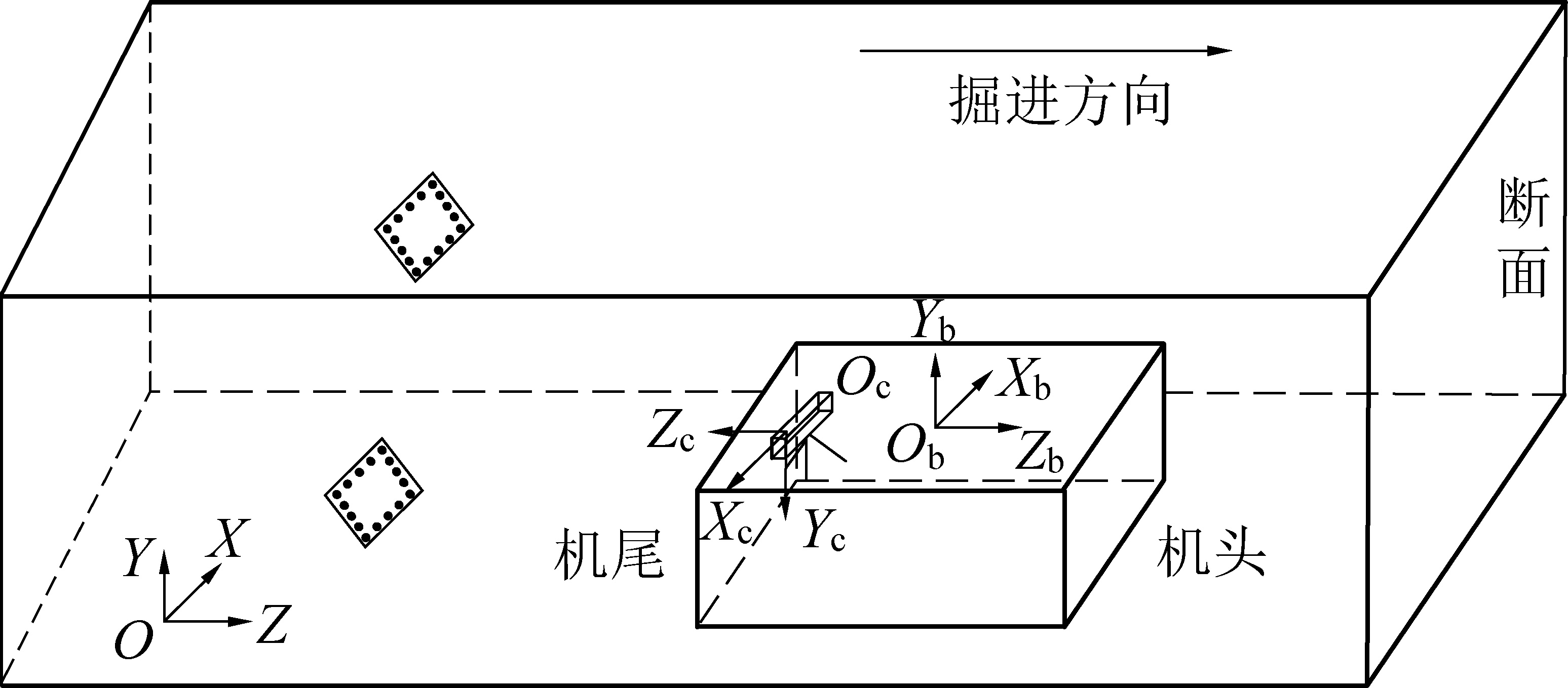 在掘进机机身重心处建立机身坐标系Ob-XbYbZb,其中x方向指向掘进机左侧并垂直于前进方向,y方向垂直向上,z方向于前进方向一致;建立双目视觉测量坐标系Oc-XcYcZc,3个方向均与机身坐标系各方向平行但方向相反。