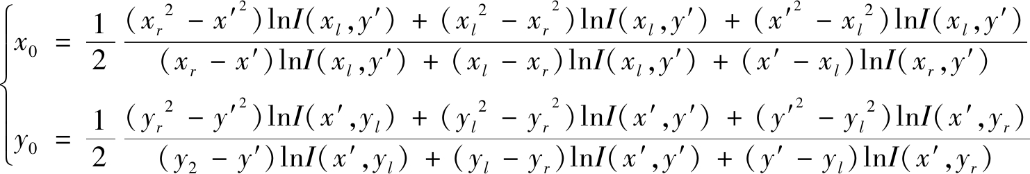 采用粗提取的方法提取光斑的中心点(x′,y′),记粗提取中心点左边的像素点坐标为(xl,y′),中心点右侧的像素坐标(xr,y′),中心点上方的像素点坐标为(x′,yup),中心点下方的像素点坐标为(x′,ydown)。由公式(6)可知: