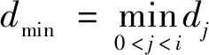 与t2时刻右图像中所有特征点Pj(xj,yj),j=1,2,3,…,n的特征向量之间的欧式距离dj,并求解欧式距离中的最小值dmin,并满足: