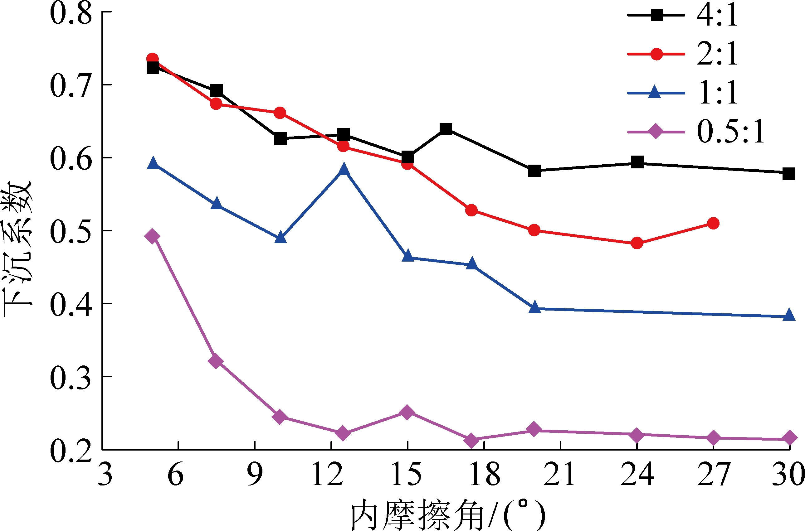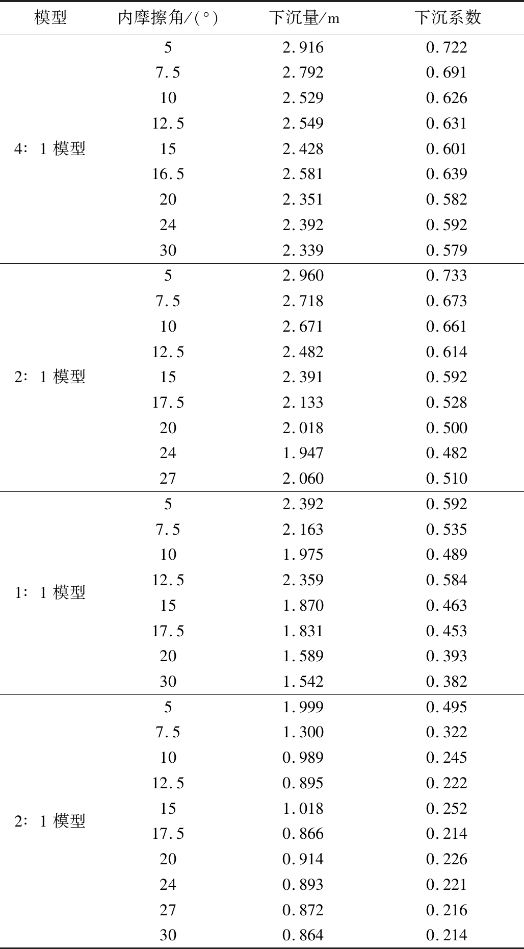 模型内摩擦角/(°)下沉量/m下沉系数4∶1模型52.9160.7227.52.7920.691102.5290.62612.52.5490.631152.4280.60116.52.5810.639202.3510.582242.3920.592302.3390.5792∶1模型52.9600.7337.52.7180.673102.6710.66112.52.4820.614152.3910.59217.52.1330.528202.0180.500241.9470.482272.0600.5101∶1模型52.3920.5927.52.1630.535101.9750.48912.52.3590.584151.8700.46317.51.8310.453201.5890.393301.5420.3822∶1模型51.9990.4957.51.3000.322100.9890.24512.50.8950.222151.0180.25217.50.8660.214200.9140.226240.8930.221270.8720.216300.8640.214