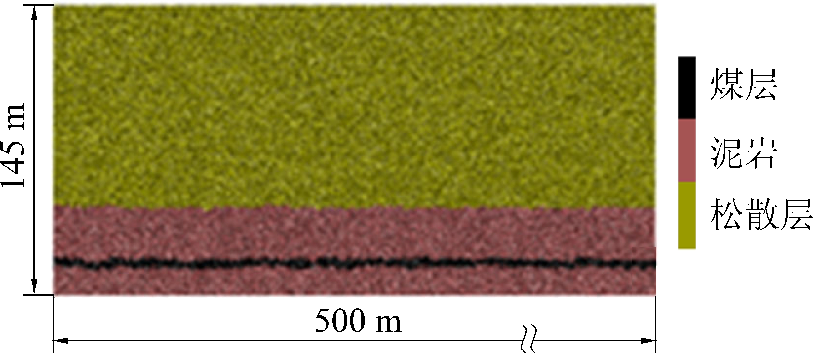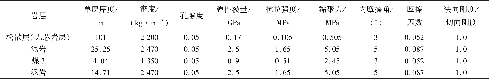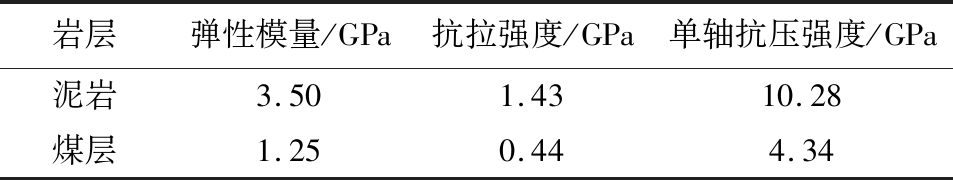 岩层弹性模量/GPa抗拉强度/GPa单轴抗压强度/GPa泥岩3.501.4310.28煤层1.250.444.34