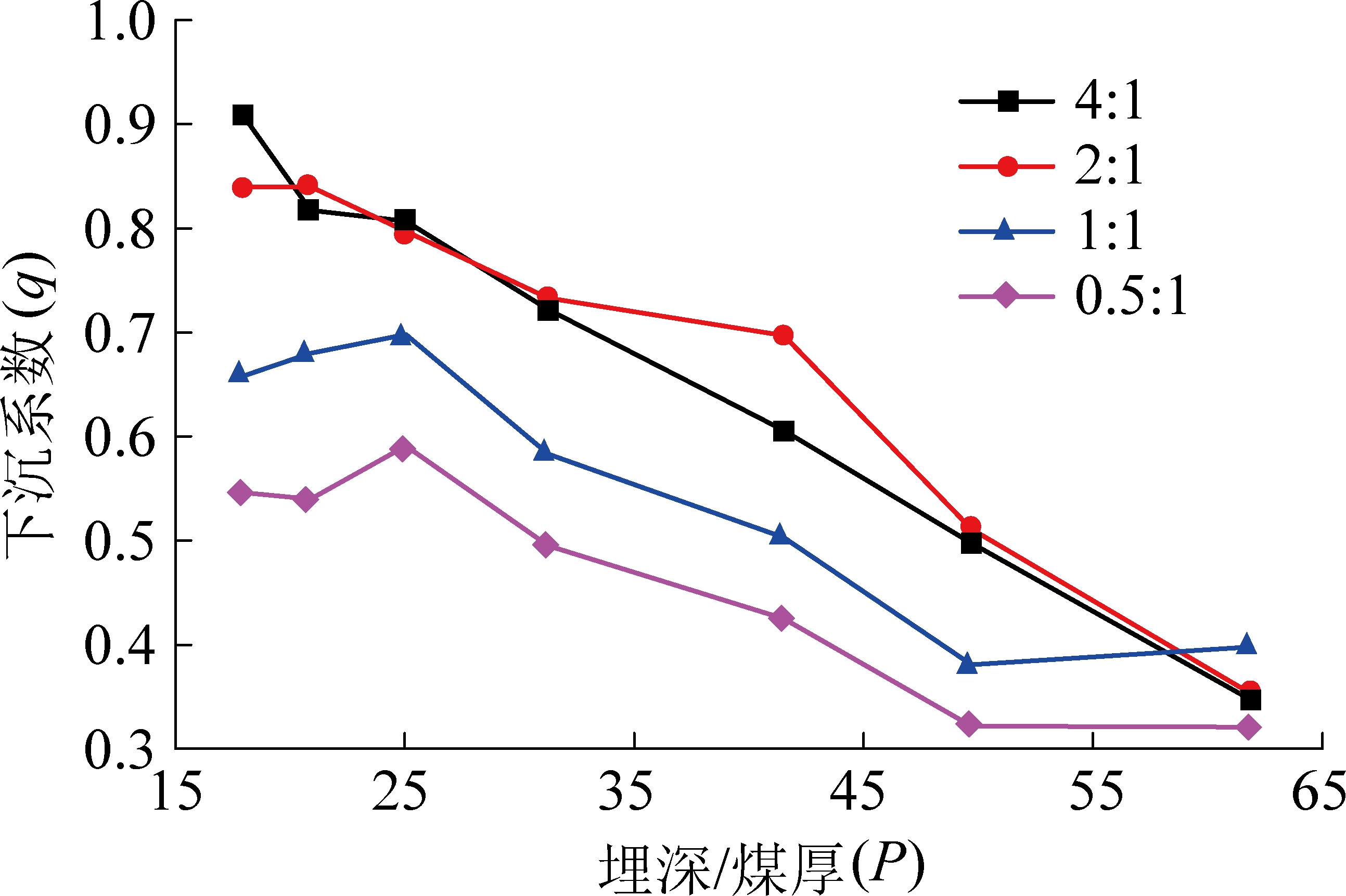 2)下沉系数基本随着埋深与煤厚比P的增大呈现线性降低趋势。当基岩厚度较大时(例如1∶1模型),地表下沉系数对埋深与煤厚比的敏感性较低,当基岩较薄时(例如4∶1模型),地表下沉系数对埋深与煤比厚的敏感性较高。