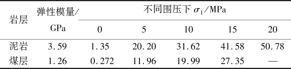 岩层弹性模量/GPa不同围压下σ1/MPa05101520泥岩3.591.3520.2031.6241.5850.78煤层1.260.27211.9619.9927.35—
