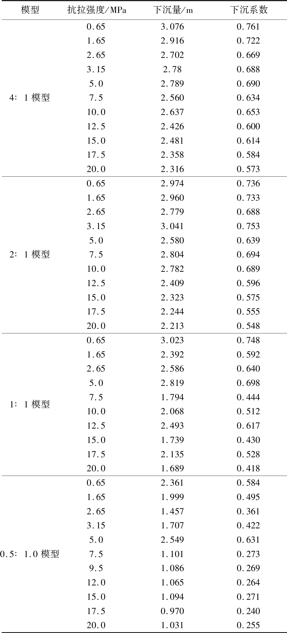 由图7可以看出,在4∶1模型、2∶1模型中,抗拉强度对下沉系数的影响规律基本一致,均呈现随抗拉强度的增大逐渐降低的趋势,同时可以看出,相同抗拉强度时两模型的下沉系数较接近。