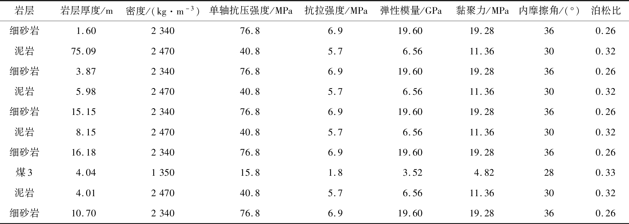 岩层岩层厚度/m密度/(kg·m-3)单轴抗压强度/MPa抗拉强度/MPa弹性模量/GPa黏聚力/MPa内摩擦角/(°)泊松比细砂岩1.60234076.86.919.6019.28360.26泥岩75.09247040.85.76.5611.36300.32细砂岩3.87234076.86.919.6019.28360.26泥岩5.98247040.85.76.5611.36300.32细砂岩15.15234076.86.919.6019.28360.26泥岩8.15247040.85.76.5611.36300.32细砂岩16.18234076.86.919.6019.28360.26煤34.04135015.81.83.524.82280.33泥岩4.01247040.85.76.5611.36300.32细砂岩10.70234076.86.919.6019.28360.26