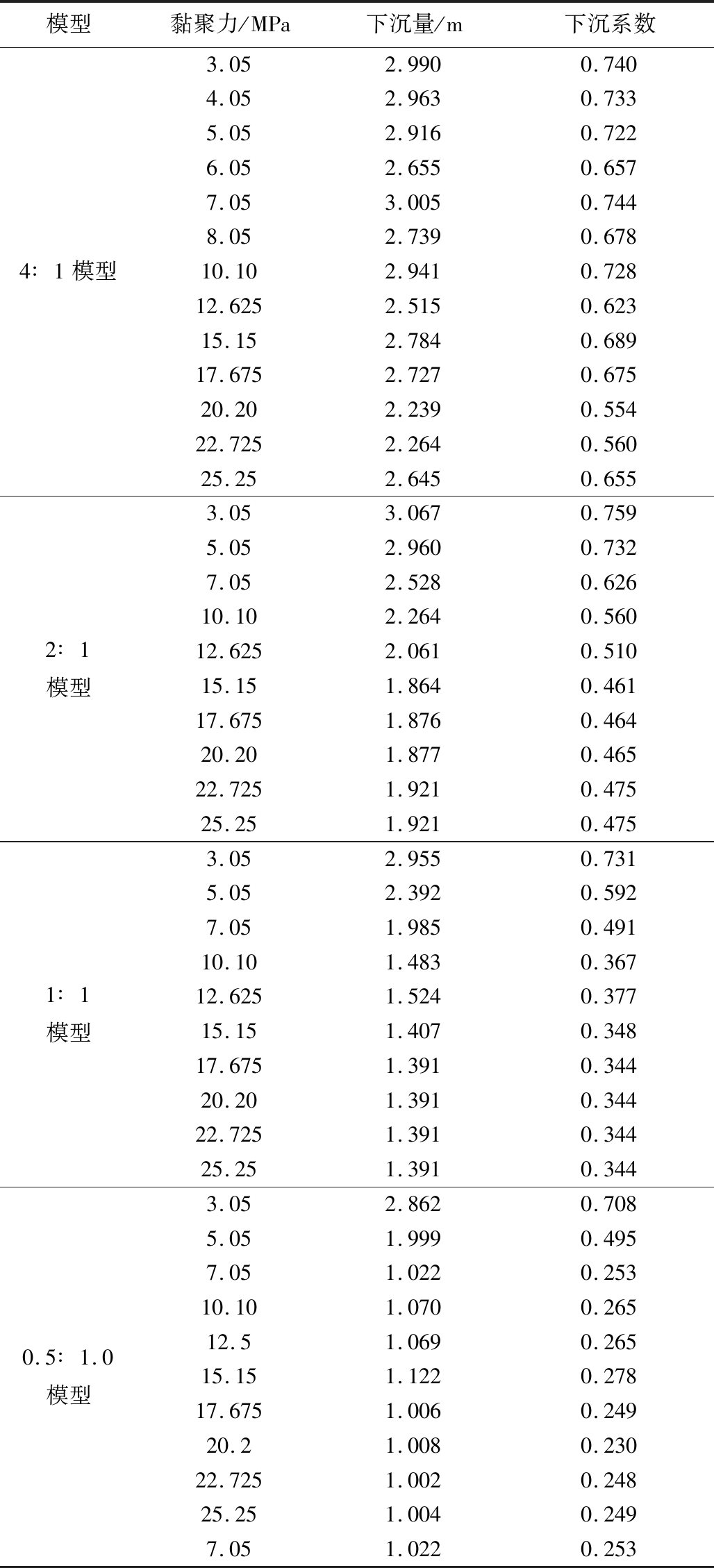 模型黏聚力/MPa下沉量/m下沉系数4∶1模型3.052.9900.7404.052.9630.7335.052.9160.7226.052.6550.6577.053.0050.7448.052.7390.67810.102.9410.72812.6252.5150.62315.152.7840.68917.6752.7270.67520.202.2390.55422.7252.2640.56025.252.6450.6552∶1模型3.053.0670.7595.052.9600.7327.052.5280.62610.102.2640.56012.6252.0610.51015.151.8640.46117.6751.8760.46420.201.8770.46522.7251.9210.47525.251.9210.4751∶1模型3.052.9550.7315.052.3920.5927.051.9850.49110.101.4830.36712.6251.5240.37715.151.4070.34817.6751.3910.34420.201.3910.34422.7251.3910.34425.251.3910.3440.5∶1.0模型3.052.8620.7085.051.9990.4957.051.0220.25310.101.0700.26512.51.0690.26515.151.1220.27817.6751.0060.24920.21.0080.23022.7251.0020.24825.251.0040.2497.051.0220.253