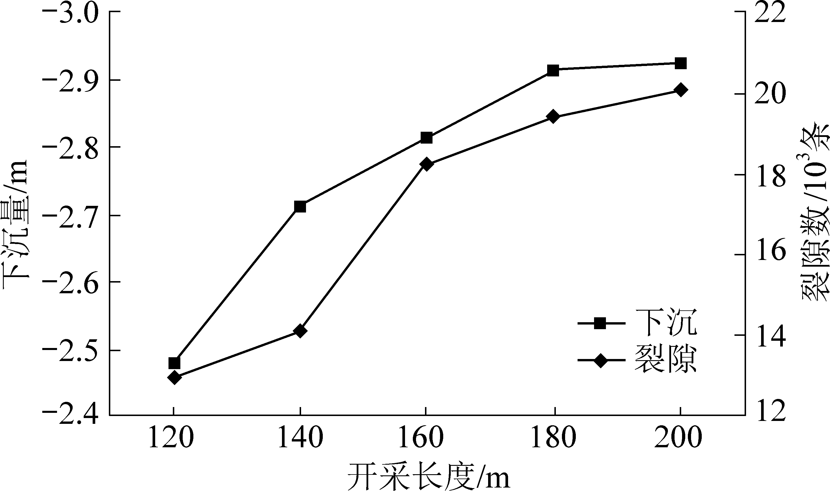 图3 地表下沉和裂隙演化与开采长度的关系