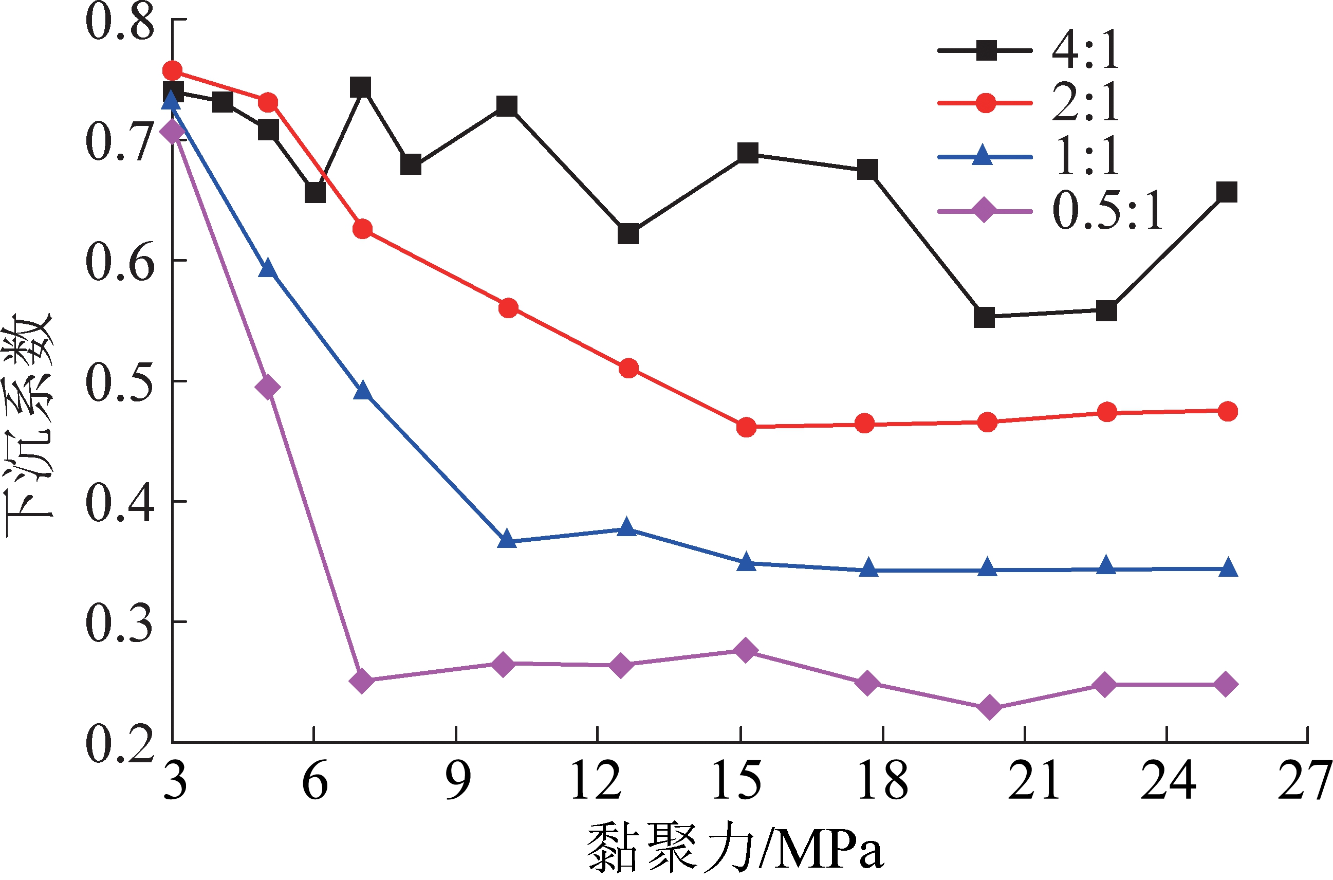 当黏聚力自3.05 MPa提高至10.10 MPa时,0.5∶1模型中下沉系数降低幅度最大,自0.708降低至0.265,1∶1模型降低幅度次之,自0.731降低至0.367,2∶1模型降低幅度较小,自0.759降低至0.560,4∶1模型降低幅度最小,自0.740降低至0.728,则从上述分析可知,基岩厚度越厚,一定范围内提高黏聚力数值下沉系数降低越大。同时可以看出,同一岩层厚度下,随着黏聚力的增大下沉系数并非一直降低,而是存在一个临界黏聚力数值,当大于该临界值时进一步提高黏聚力时下沉系数基本无变化。对比发现,在0.5∶1、1∶1、2∶1和4∶1模型中该临界黏聚力分别是7.05、10.10、15.15和20.2 MPa,该临界值呈现随着基岩厚度降低逐渐增大的趋势。