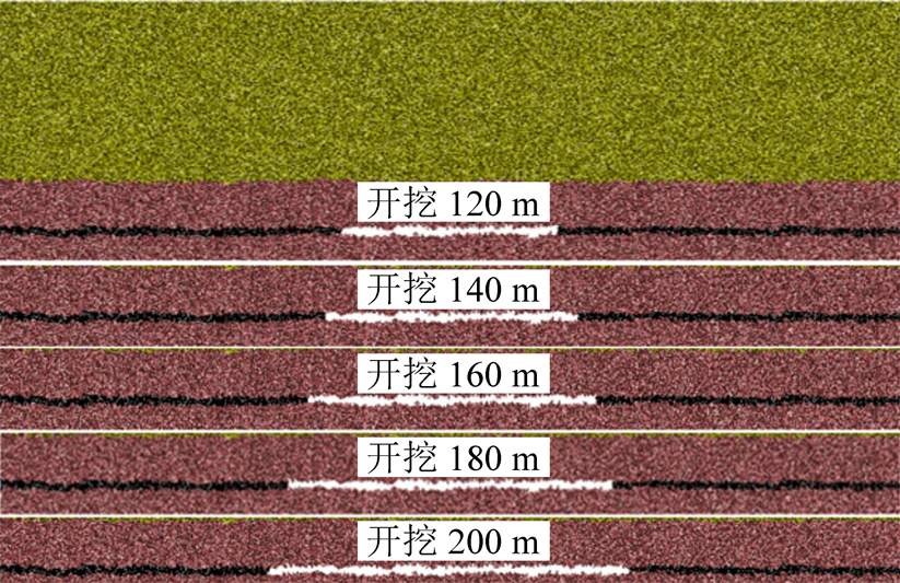在数值模型中,当开挖尺寸不同时对地表下沉的影响程度不同,鉴于此,基于建立数值模型,依次计算分析在模型中间位置分别开挖120、140、160、180、200 m时地表下沉规律的差异,模拟获得120~200 m开挖尺寸模型如图2所示,地表下沉和裂隙演化与开采长度的关系如图3所示。