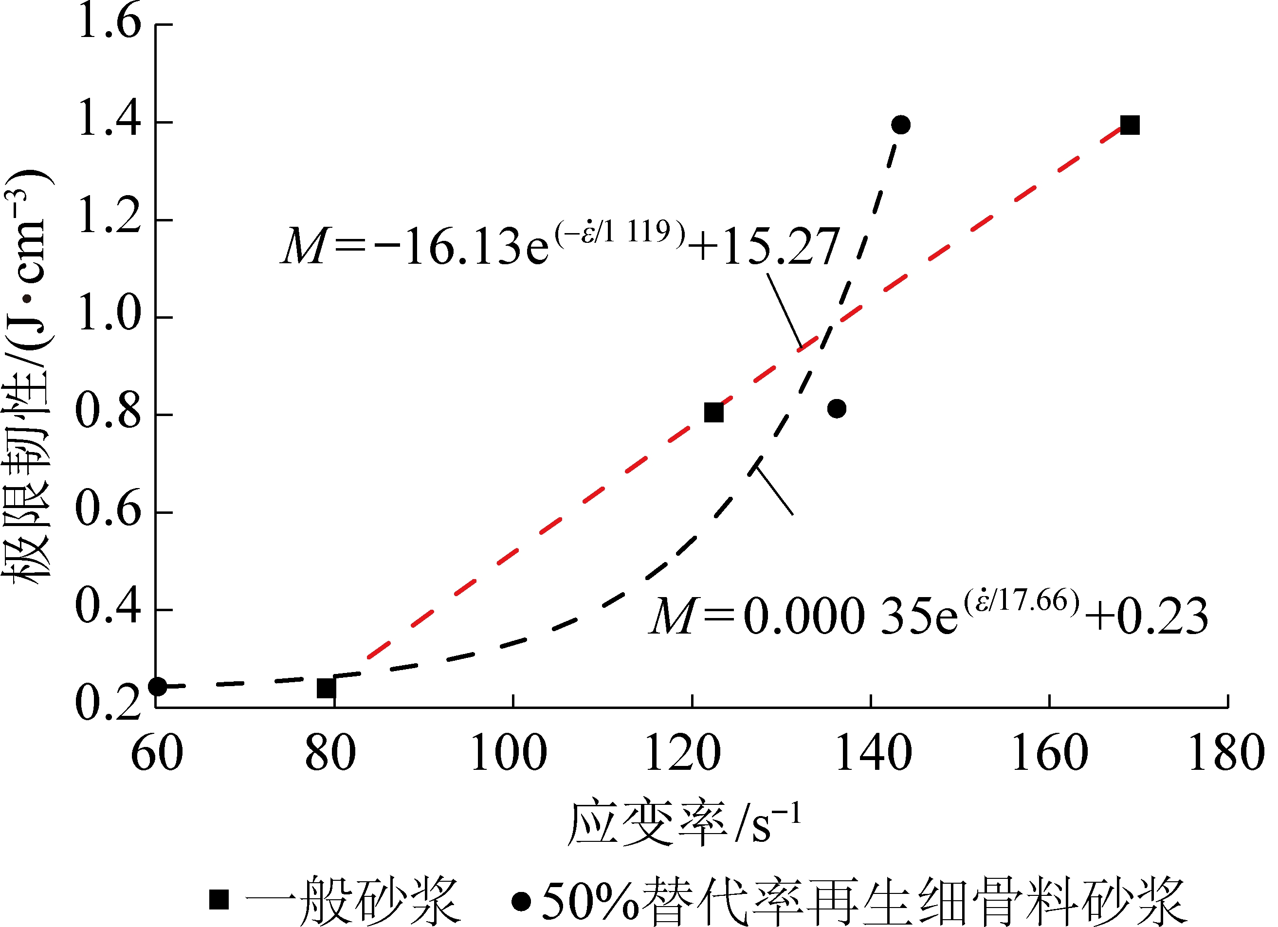 由图5可知,50%替代率再生细骨料砂浆与普通砂浆的极限韧性都随着应变率增加而增大,但50%替代率再生细骨料砂浆其极限韧性增速远大于普通砂浆,这说明在高应变率情况下,50%替代率再生细骨料砂浆能够比普通砂浆吸收更多的冲击能量,起到更好的保护作用。