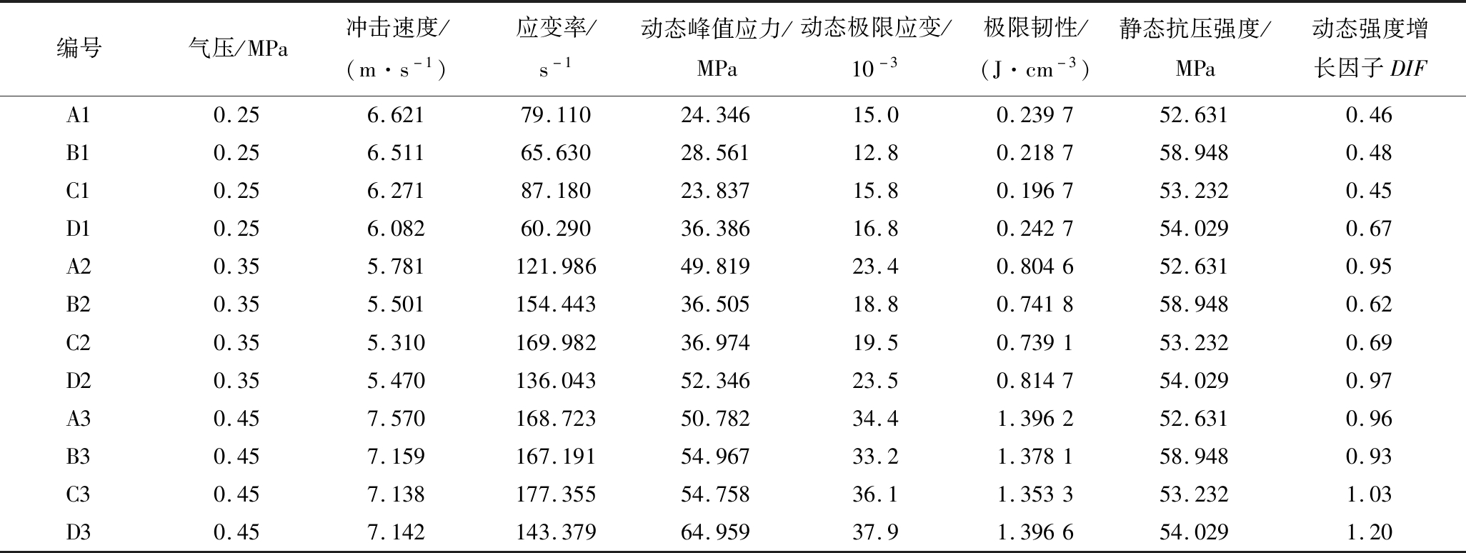 编号气压/MPa冲击速度/(m·s-1)应变率/s-1动态峰值应力/MPa动态极限应变/10-3极限韧性/(J·cm-3)静态抗压强度/MPa动态强度增长因子DIFA10.256.62179.11024.34615.00.239752.6310.46B10.256.51165.63028.56112.80.218758.9480.48C10.256.27187.18023.83715.80.196753.2320.45D10.256.08260.29036.38616.80.242754.0290.67A20.355.781121.98649.81923.40.804652.6310.95B20.355.501154.44336.50518.80.741858.9480.62C20.355.310169.98236.97419.50.739153.2320.69D20.355.470136.04352.34623.50.814754.0290.97A30.457.570168.72350.78234.41.396252.6310.96B30.457.159167.19154.96733.21.378158.9480.93C30.457.138177.35554.75836.11.353353.2321.03D30.457.142143.37964.95937.91.396654.0291.20