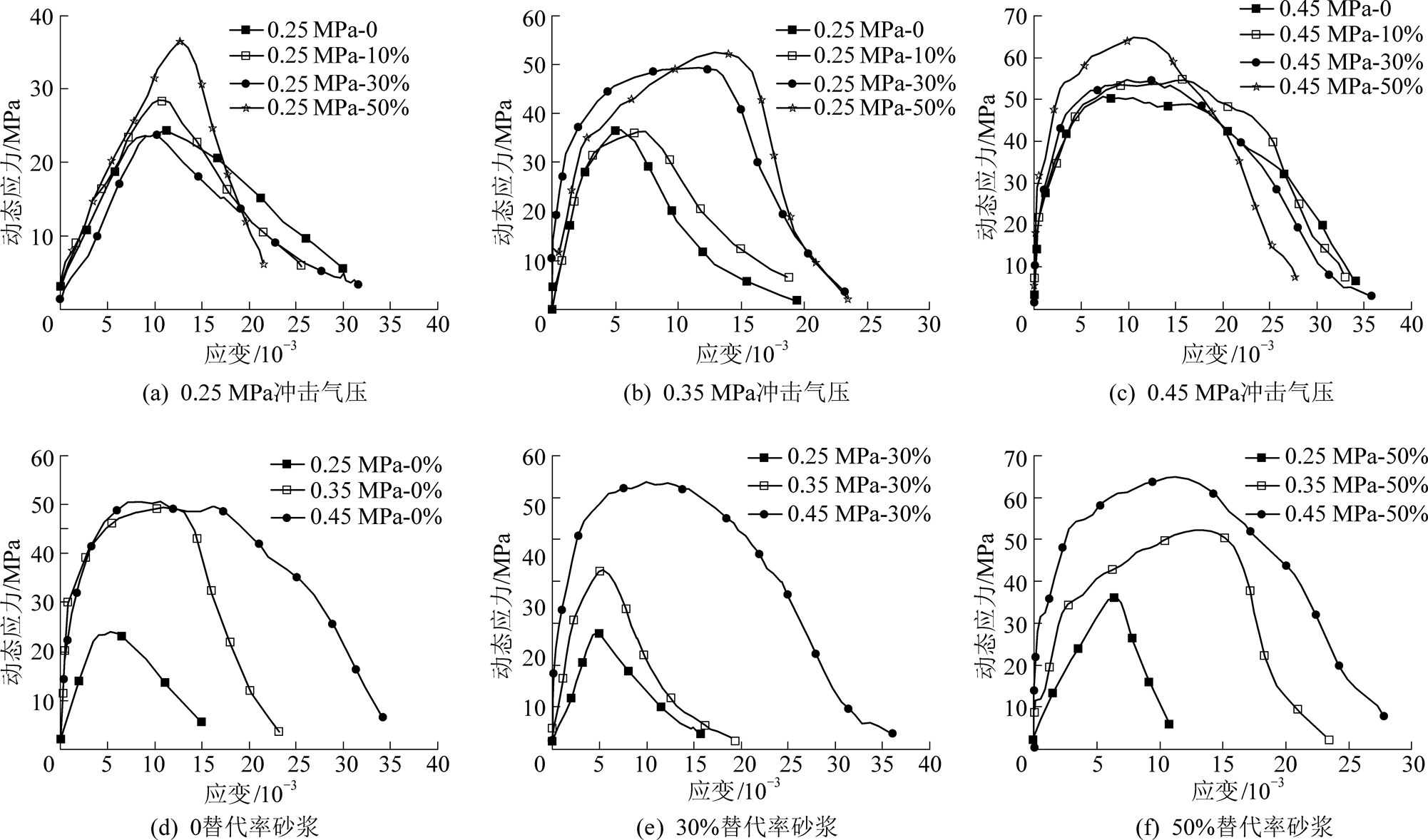 根据式(1)—式(3)对入射杆和透射杆应变片测得的脉冲波形信号(图1)进行计算,得到砂浆试块在冲击荷载下的应力 σ和应变 ε的关系曲线,如图3所示。由图3可知,砂浆试块的应力应变曲线可分为4个阶段:压密阶段、弹性阶段和屈服阶段、破坏阶段。在压密阶段,入射杆与试件接触面逐渐压实,在应力的作用下,试块内部缺陷、空隙逐渐压密,试块的抗变形能力不断增加[17],在此阶段,曲线呈下凹特征;在弹性阶段,轴向应力随应变近似为线性增长,曲线斜率基本保持不变,因此该段斜率可作为试块的动态弹性模量,试件内缺陷几乎没有新的发展;随着作用在试件上的应力持续增大,试件进入到屈服阶段,此时曲线呈上凸特征,轴向应力随应变的增长趋势减缓,试件内裂纹逐渐扩展;应力达到峰值后,应力随应变的增大快速下降,试件进入破坏阶段,受载超过试块强度极限,随之破坏。其中,部分曲线在初始阶段中出现了下凹段,是应力跌落现象,这是因为试块表面的不平整部分先接触到入射杆,承受冲击荷载后随即破裂,在出现短时间应力跌落之后,试块的其他部分接触到入射杆,应力开始回升。