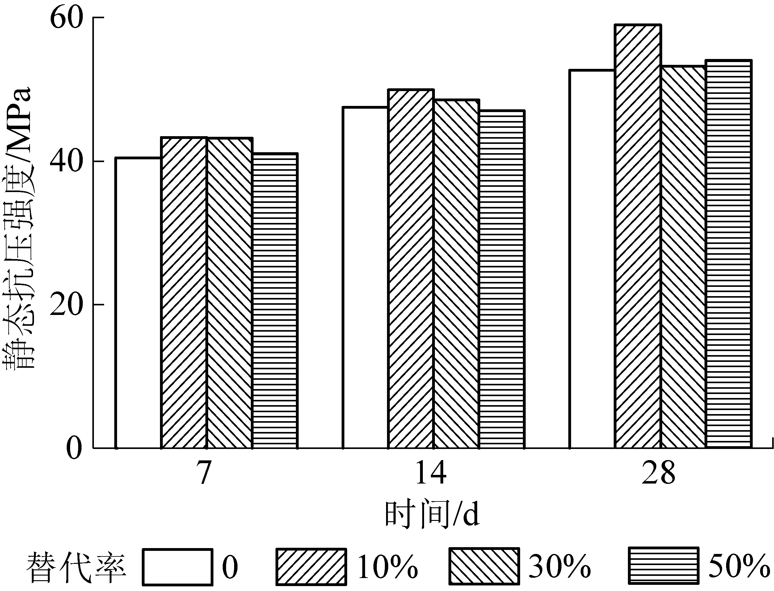 图2为不同再生细骨料替代率水泥砂浆静态抗压强度,由图2知使用再生细骨料替代部分天然细骨料的水泥砂浆,在7、14、28 d时,随着替代率由低到高,其静态抗压强度都大于或等于一般对照组的静态抗压强度。其中,再生细骨料替代率为10%时,水泥砂浆的静态抗压强度最高,替代率为30%及50%时,静态抗压强度略有下降,但依然能与一般对照组持平。出现上述结果一方面是因为试验中所使用的再生细骨料性能比较优异;另一方面是因为再生细骨料含有残余水泥浆,其孔隙率较高,造成用拌合物制作的再生水泥砂浆具有较强吸水性,实际水泥水化用水减少,通过微降低实际水灰比提高强度,且水分被吸入裂缝和空隙中,形成局部加湿的养护环境有利于水泥砂浆养护和性能提升[16],当替代率达到30%和50%时,由于砂浆密实程度降低,静态抗压强度有所下降。